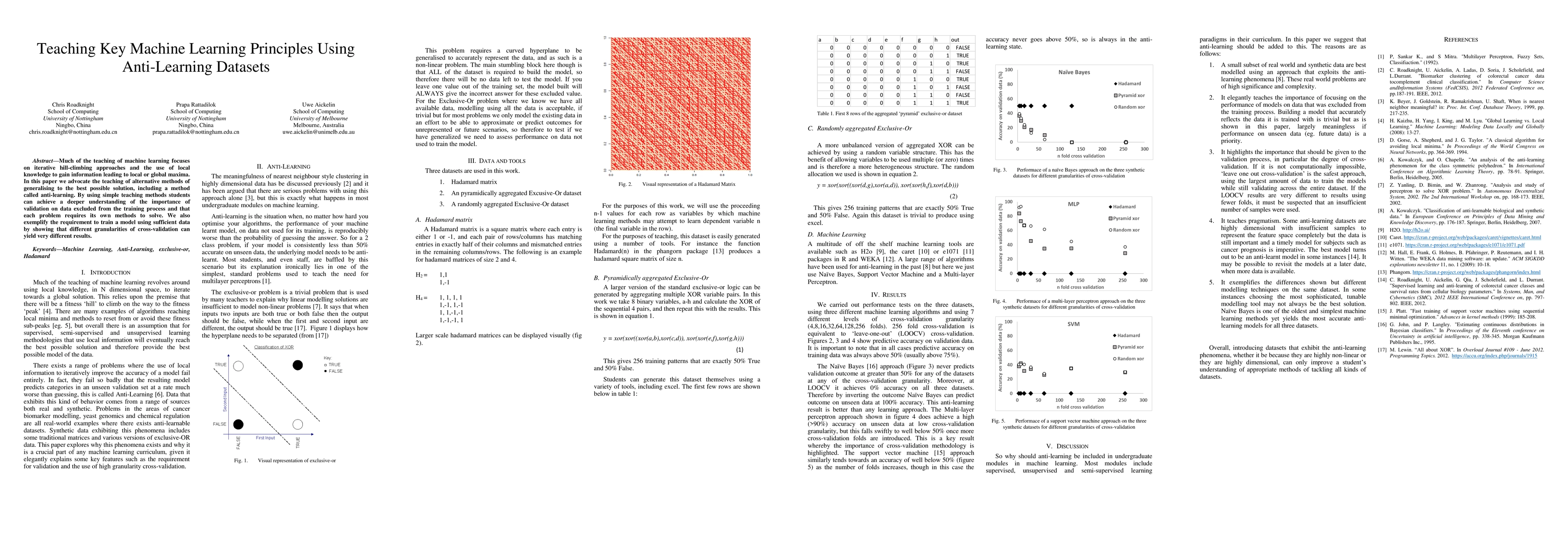 Researchers propose teaching machine learning principles using anti-learning datasets to promote deeper understanding of validation and problem-solving methods. This approach highlights the importance of training models with sufficient data and varying granularities of cross-validation.