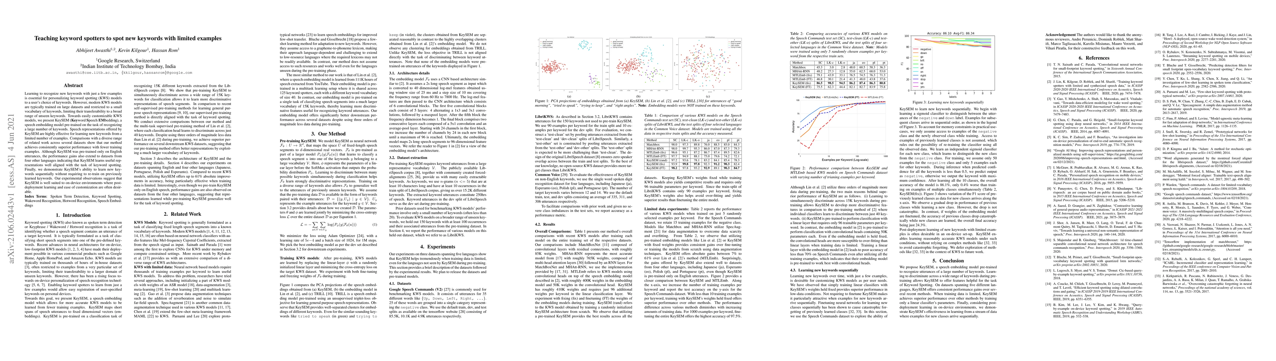 Learning to recognize new keywords with just a few examples is essential for personalizing keyword spotting (KWS) models to a user's choice of keywords. However, modern KWS models are typically trained on large datasets and restricted to a small vocabulary of keywords, limiting their transferability to a broad range of unseen keywords. Towards easily customizable KWS models, we present KeySEM (Keyword Speech EMbedding), a speech embedding model pre-trained on the task of recognizing a large number of keywords. Speech representations offered by KeySEM are highly effective for learning new keywords from a limited number of examples. Comparisons with a diverse range of related work across several datasets show that our method achieves consistently superior performance with fewer training examples. Although KeySEM was pre-trained only on English utterances, the performance gains also extend to datasets from four other languages indicating that KeySEM learns useful representations well aligned with the task of keyword spotting. Finally, we demonstrate KeySEM's ability to learn new keywords sequentially without requiring to re-train on previously learned keywords. Our experimental observations suggest that KeySEM is well suited to on-device environments where post-deployment learning and ease of customization are often desirable.