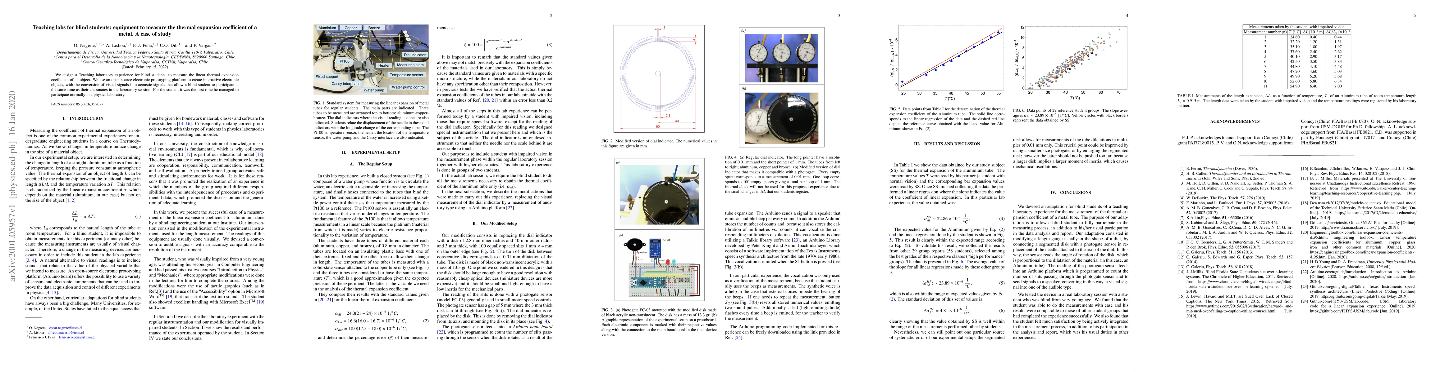 We design a Teaching laboratory experience for blind students, to measure the linear thermal expansion coefficient of an object. We use an open-source electronic prototyping platform to create interactive electronic objects, with the conversion of visual signals into acoustic signals that allow a blind student to participate at the same time as their classmates in the laboratory session. For the student it was the first time he managed to participate normally in a physics laboratory.