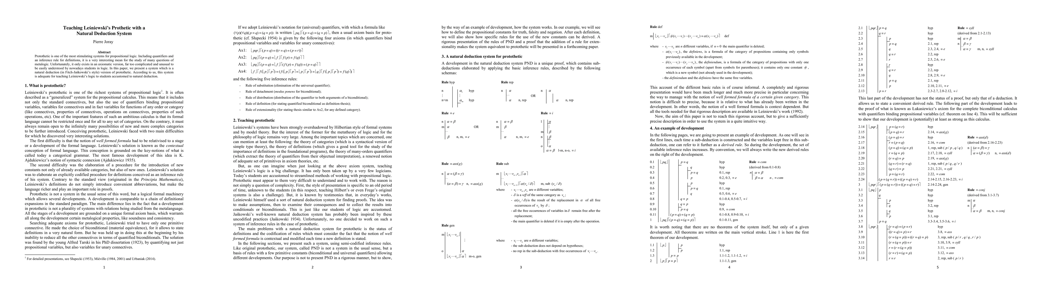 Protothetic is one of the most stimulating systems for propositional logic. Including quantifiers and an inference rule for definitions, it is a very interesting mean for the study of many questions of metalogic. Unfortunately, it only exists in an axiomatic version, far too complicated and unusual to be easily understood by nowadays students in logic. In this paper, we present a system which is a natural deduction (in Fitch-Ja\'skowski's style) version of protothetic. According to us, this system is adequate for teaching Le\'sniewski's logic to students accustomed to natural deduction.