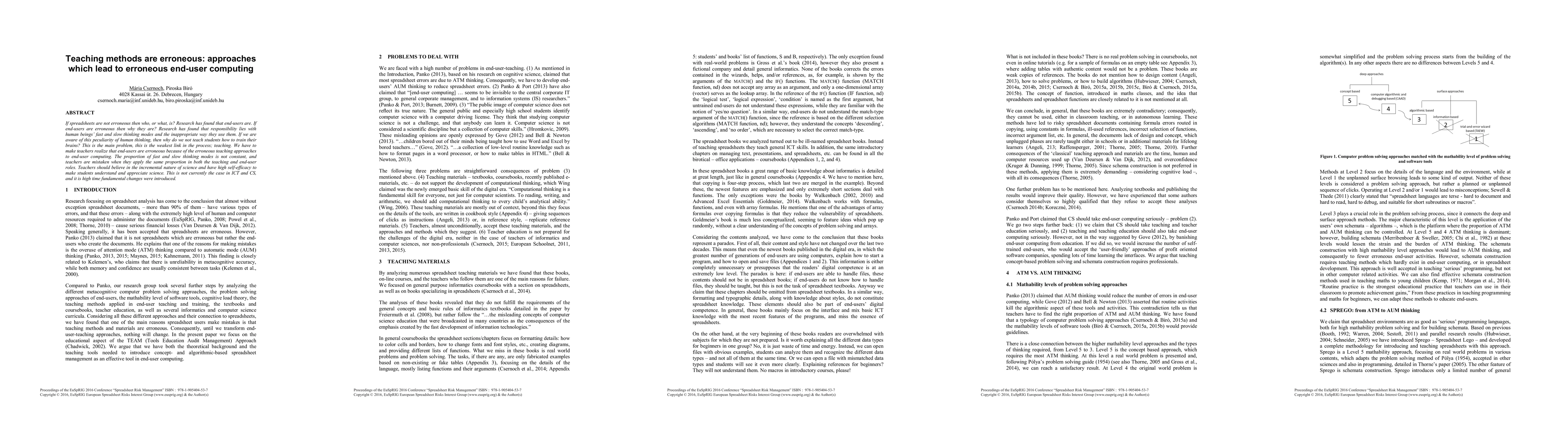 If spreadsheets are not erroneous then who, or what, is? Research has found that end-users are. If end-users are erroneous then why are they? Research has found that responsibility lies with human beings' fast and slow thinking modes and the inappropriate way they use them. If we are aware of this peculiarity of human thinking, then why do we not teach students how to train their brains? This is the main problem, this is the weakest link in the process: teaching. We have to make teachers realize that end-users are erroneous because of the erroneous teaching approaches to end-user computing. The proportion of fast and slow thinking modes is not constant, and teachers are mistaken when they apply the same proportion in both the teaching and end-user roles. Teachers should believe in the incremental nature of science and have high self-efficacy to make students understand and appreciate science. This is not currently the case in ICT and CS, and it is high time fundamental changes were introduced.