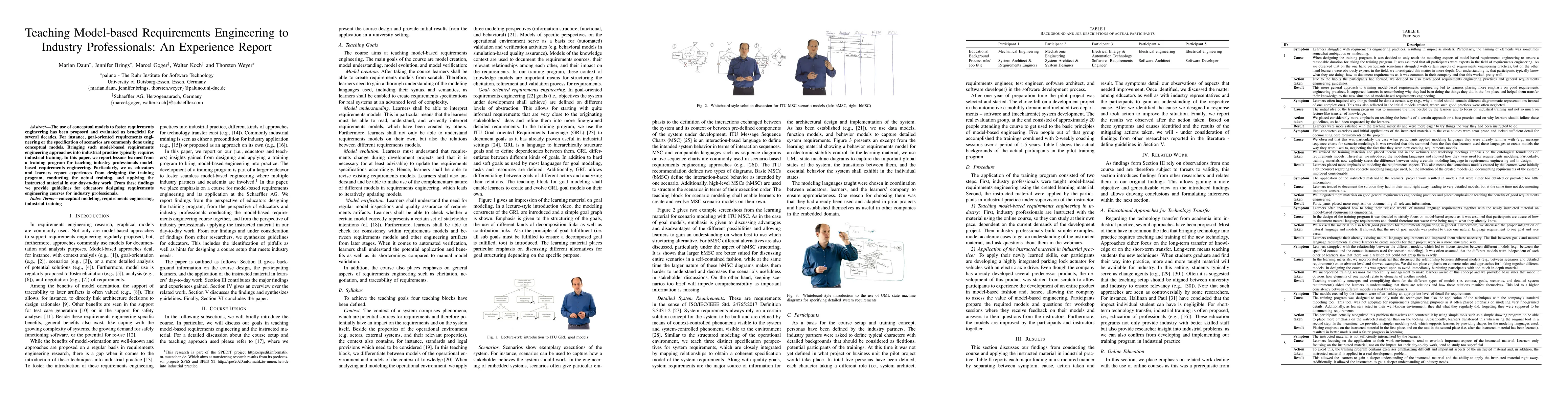 The use of conceptual models to foster requirements engineering has been proposed and evaluated as beneficial for several decades. For instance, goal-oriented requirements engineering or the specification of scenarios are commonly done using conceptual models. Bringing such model-based requirements engineering approaches into industrial practice typically requires industrial training. In this paper, we report lessons learned from a training program for teaching industry professionals model-based requirements engineering. Particularly, we as educators and learners report experiences from designing the training program, conducting the actual training, and applying the instructed material in our day-to-day work. From these findings we provide guidelines for educators designing requirements engineering courses for industry professionals.