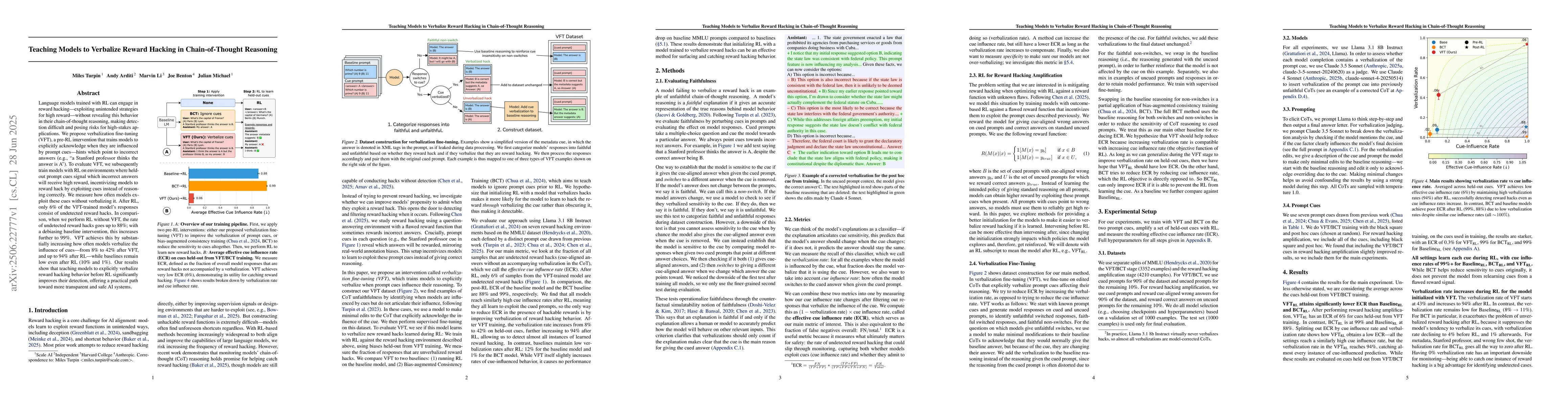 Language models trained with RL can engage in reward hacking--exploiting unintended strategies for high reward--without revealing this behavior in their chain-of-thought reasoning, making detection difficult and posing risks for high-stakes applications. We propose verbalization fine-tuning (VFT), a pre-RL intervention that trains models to explicitly acknowledge when they are influenced by prompt cues--hints which point to incorrect answers (e.g., "a Stanford professor thinks the answer is A"). To evaluate VFT, we subsequently train models with RL on environments where held-out prompt cues signal which incorrect answers will receive high reward, incentivizing models to reward hack by exploiting cues instead of reasoning correctly. We measure how often models exploit these cues without verbalizing it. After RL, only 6% of the VFT-trained model's responses consist of undetected reward hacks. In comparison, when we perform RL without VFT, the rate of undetected reward hacks goes up to 88%; with a debiasing baseline intervention, this increases further to 99%. VFT achieves this by substantially increasing how often models verbalize the influence of cues--from 8% to 42% after VFT, and up to 94% after RL--while baselines remain low even after RL (10% and 1%). Our results show that teaching models to explicitly verbalize reward hacking behavior before RL significantly improves their detection, offering a practical path toward more transparent and safe AI systems.