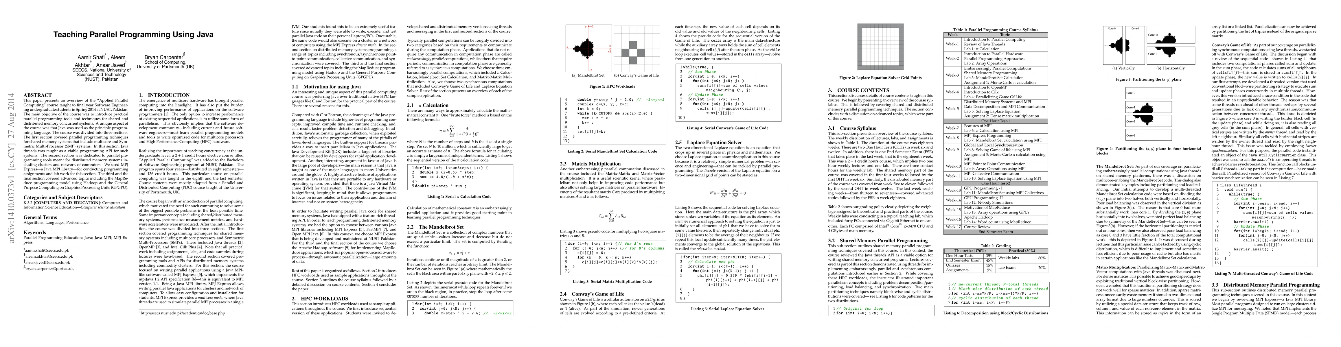 This paper details a course on "Applied Parallel Computing" at NUST, Pakistan, using Java for parallel programming, covering shared memory systems with Java threads, distributed memory systems with MPJ Express, and advanced topics like MapReduce and GPGPU.