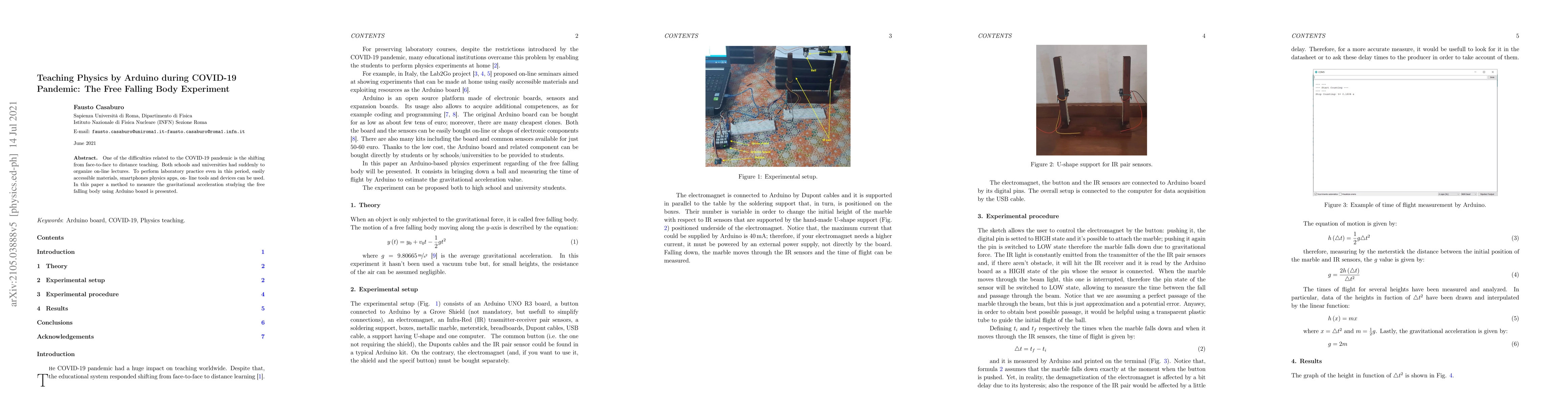 This paper presents a method for teaching physics using an Arduino board to measure gravitational acceleration during the COVID-19 pandemic, enabling distance learning through accessible materials and online tools. The experiment focuses on studying free falling bodies to demonstrate practical physics applications.