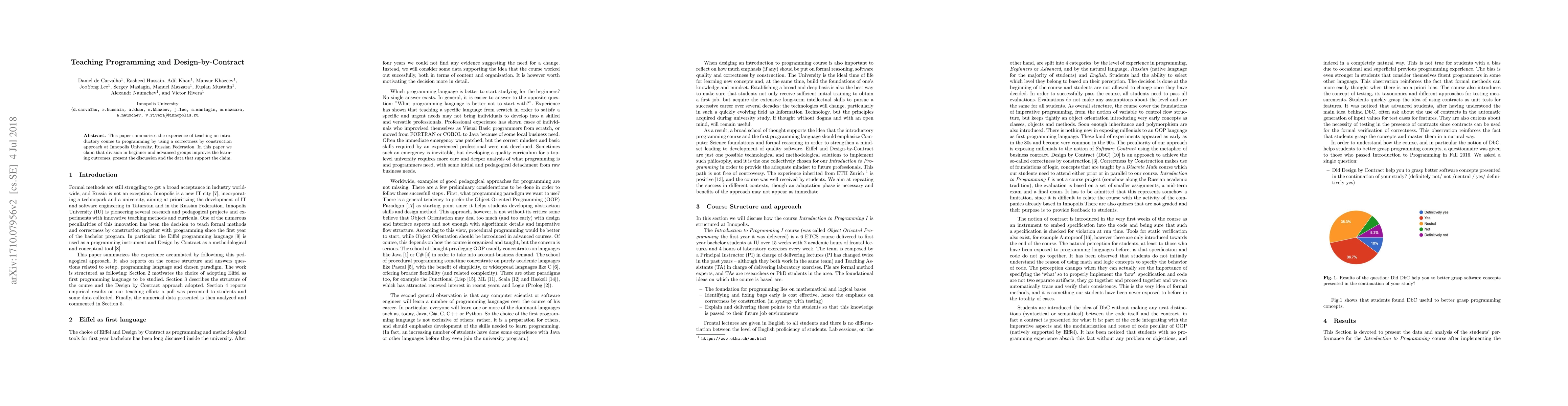 This paper summarizes the experience of teaching an introductory course to programming by using a correctness by construction approach at Innopolis University, Russian Federation. In this paper we claim that division in beginner and advanced groups improves the learning outcomes, present the discussion and the data that support the claim.