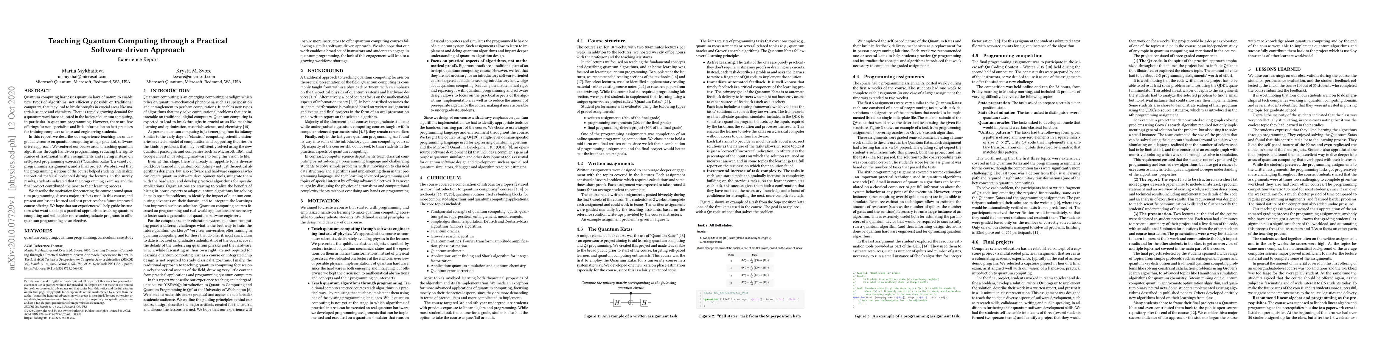 This report details an undergraduate quantum computing course emphasizing practical, software-driven quantum programming. The course utilized "Quantum Katas" and programming assignments, which students found most beneficial for learning, highlighting the importance of hands-on experience in understanding quantum algorithms.
