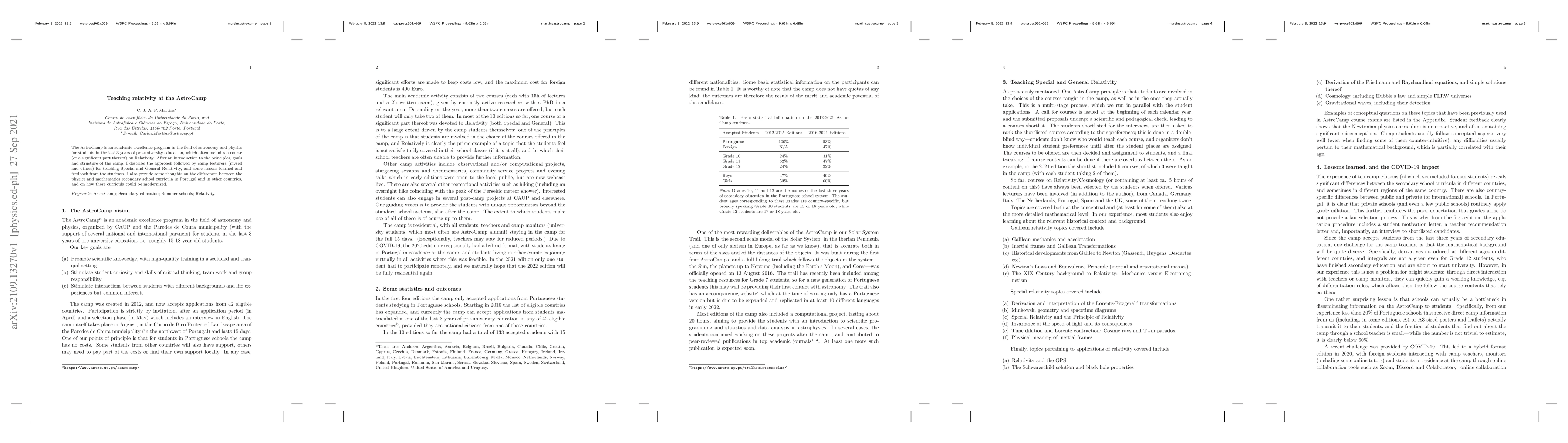 The AstroCamp is an academic excellence program in the field of astronomy and physics for students in the last 3 years of pre-university education, which often includes a course (or a significant part thereof) on Relativity. After an introduction to the principles, goals and structure of the camp, I describe the approach followed by camp lecturers (myself and others) for teaching Special and General Relativity, and some lessons learned and feedback from the students. I also provide some thoughts on the differences between the physics and mathematics secondary school curricula in Portugal and in other countries, and on how these curricula could be modernized.