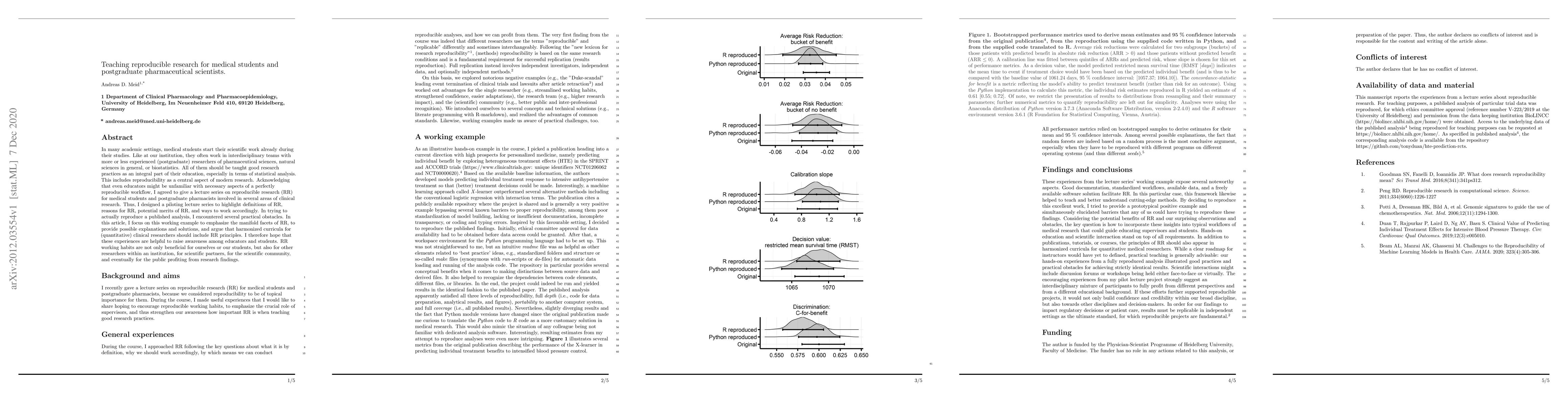 The paper discusses the author's experience in teaching reproducible research (RR) principles to medical students and postgraduate pharmaceutical scientists. Facing challenges in reproducing a published analysis, the author highlights the importance of RR in fostering transparent, reliable research beneficial to the scientific community and public. The author advocates for integrating RR principles into curricula for quantitative clinical researchers.