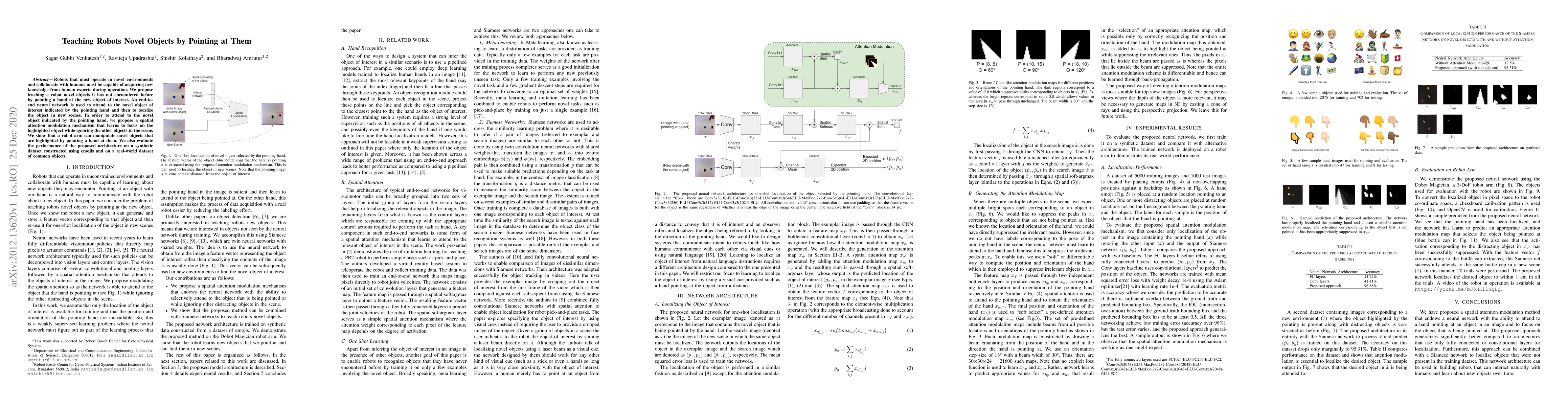 Robots that must operate in novel environments and collaborate with humans must be capable of acquiring new knowledge from human experts during operation. We propose teaching a robot novel objects it has not encountered before by pointing a hand at the new object of interest. An end-to-end neural network is used to attend to the novel object of interest indicated by the pointing hand and then to localize the object in new scenes. In order to attend to the novel object indicated by the pointing hand, we propose a spatial attention modulation mechanism that learns to focus on the highlighted object while ignoring the other objects in the scene. We show that a robot arm can manipulate novel objects that are highlighted by pointing a hand at them. We also evaluate the performance of the proposed architecture on a synthetic dataset constructed using emojis and on a real-world dataset of common objects.
