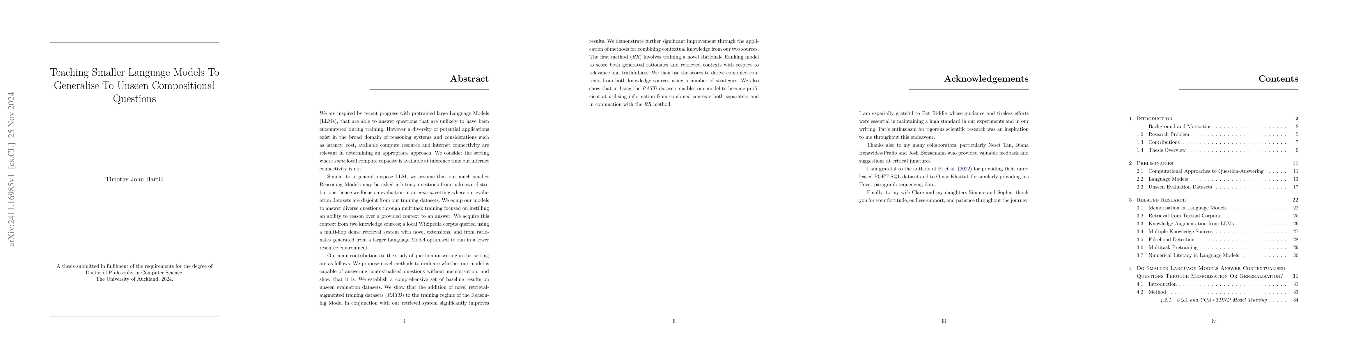 This research explores methods to teach smaller language models to generalize and answer unseen compositional questions, focusing on scenarios with limited internet connectivity and local compute capacity. It introduces novel techniques to enhance model reasoning through retrieved contexts from Wikipedia and generated rationales, establishing significant improvements through combined knowledge sources and retrieval-augmented training datasets.