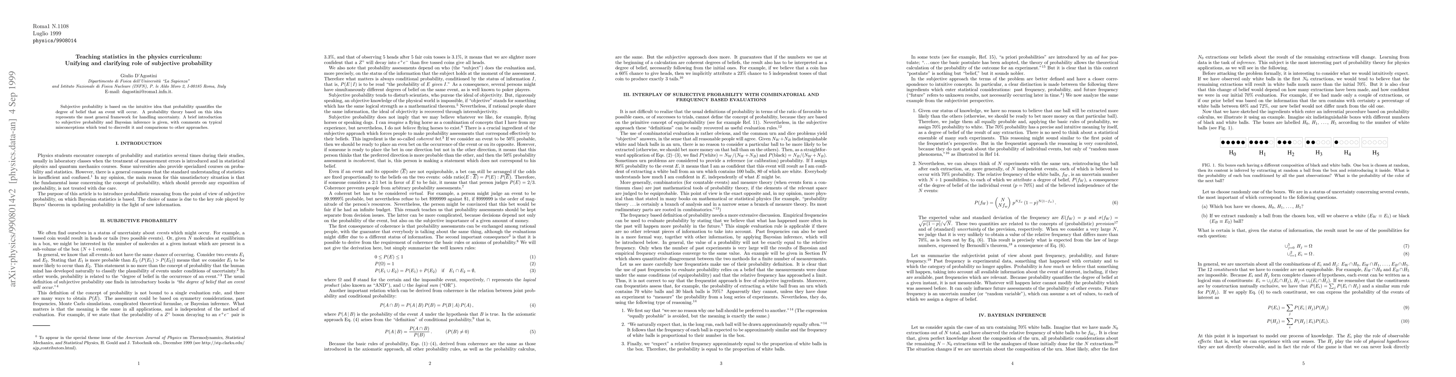 This paper explores the role of subjective probability in teaching statistics to physics students, clarifying its importance and unifying it with Bayesian inference. It aims to address common misconceptions about subjective probability and promote a better understanding of uncertainty in physics education.