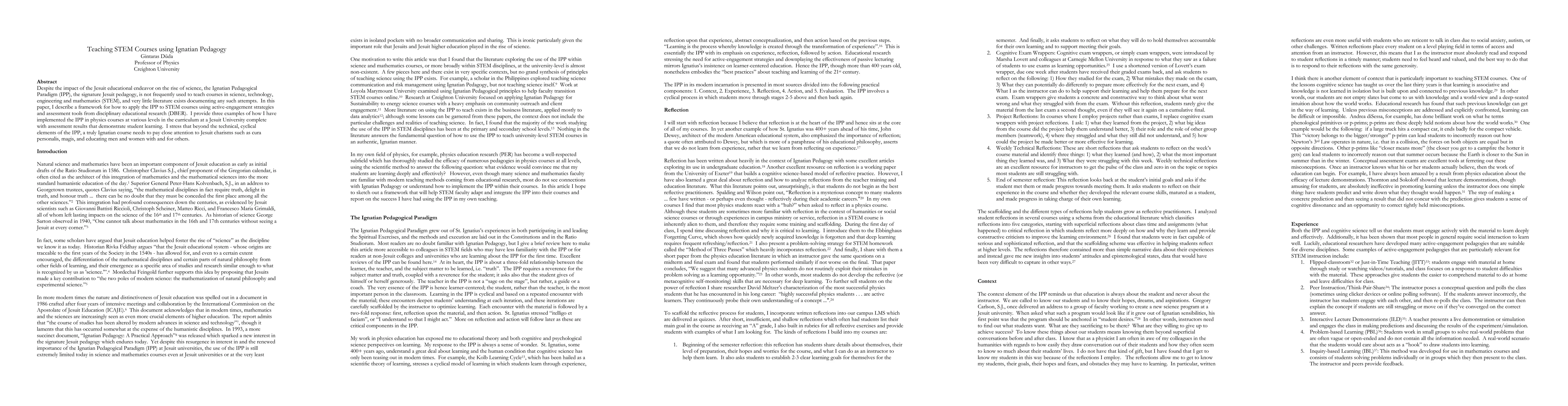 Despite the impact of the Jesuit educational endeavor on the rise of science, the Ignatian Pedagogical Paradigm (IPP), the signature Jesuit pedagogy, is not frequently used to teach courses in science, technology, engineering and mathematics (STEM), and very little literature exists documenting any such attempts. In this paper, I describe a framework for how to apply the IPP to STEM courses using active-engagement strategies and assessment tools from disciplinary educational research (DBER). I provide three examples of how I have implemented the IPP in physics courses at various levels in the curriculum at a Jesuit University complete with assessment results that demonstrate student learning. I stress that beyond the technical, cyclical elements of the IPP, a truly Ignatian course needs to pay close attention to Jesuit charisms such as cura personalis, magis, and educating men and women with and for others.