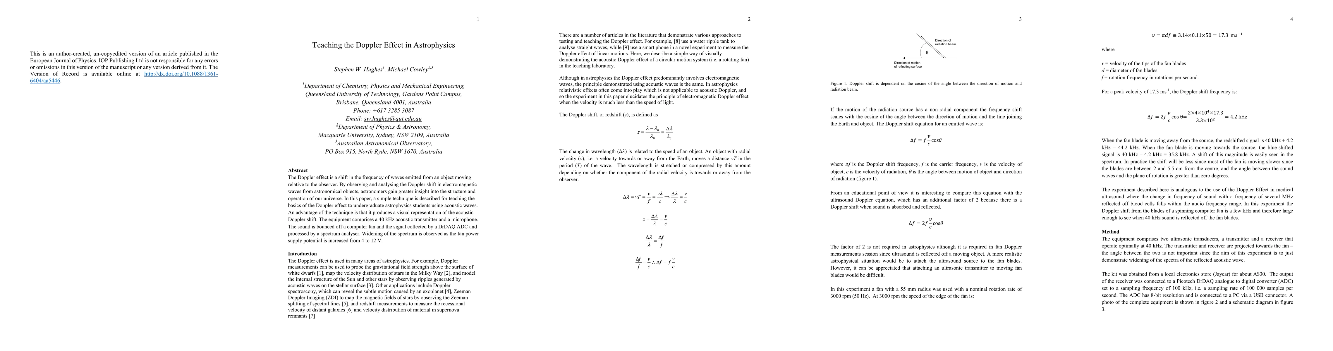 This paper describes a simple method to teach the Doppler effect to astrophysics undergraduates using acoustic waves, where a 40 kHz transmitter and microphone demonstrate the visual representation of the Doppler shift by bouncing sound off a moving fan. The experiment shows spectrum widening with increasing fan speed, aiding comprehension of astronomical Doppler shifts.