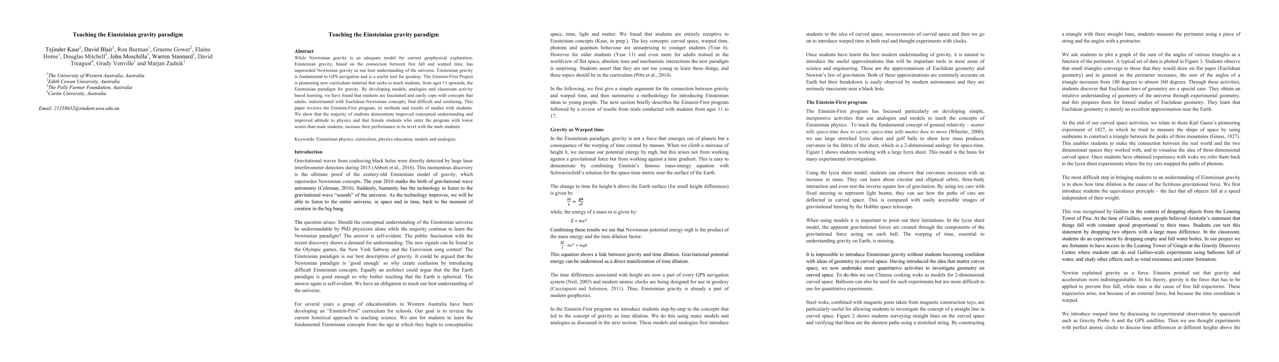 While Newtonian gravity is an adequate model for current geophysical exploration, Einsteinian gravity, based on the connection between free fall and warped time, has superseded Newtonian gravity as our best understanding of the universe. Einsteinian gravity is fundamental to GPS navigation and is a useful tool for geodesy. The Einstein-First Project is pioneering new curriculum material that seeks to teach students, from ages 11 upwards, the Einsteinian paradigm for gravity. By developing models, analogies and classroom activity based learning, we have found that students are fascinated and easily cope with concepts that adults, indoctrinated with Euclidean-Newtonian concepts, find difficult and confusing. This paper reviews the Einstein-First program, its methods and results of studies with students. We show that the majority of students demonstrate improved conceptual understanding and improved attitude to physics and that female students who enter the program with lower scores than male students, increase their performance to be level with the male students.
