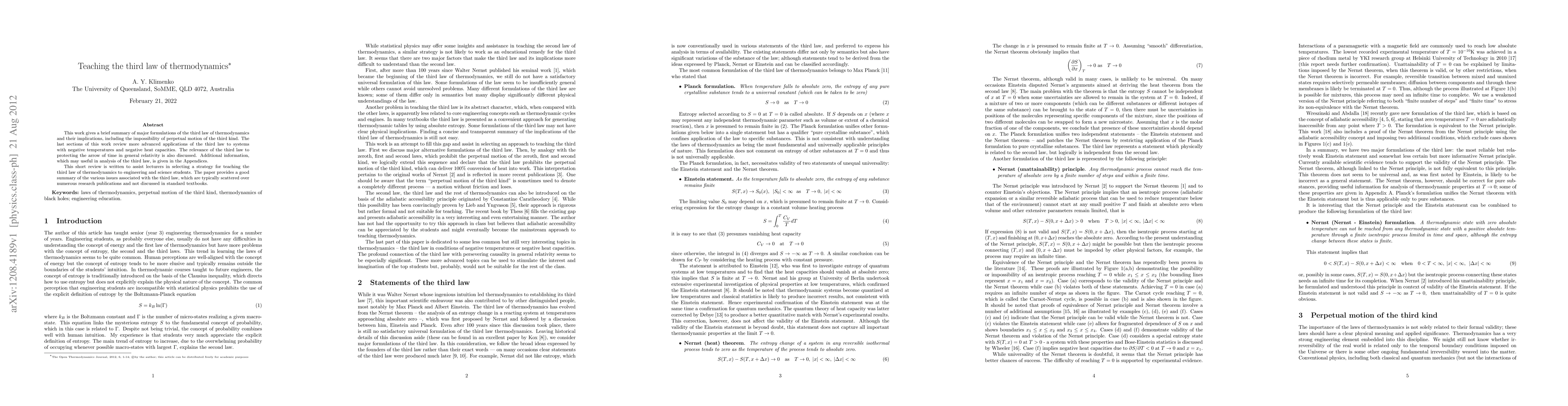 This work gives a brief summary of major formulations of the third law of thermodynamics and their implications, including the impossibility of perpetual motion of the third kind. The last sections of this work review more advanced applications of the third law to systems with negative temperatures and negative heat capacities. The relevance of the third law to protecting the arrow of time in general relativity is also discussed. Additional information, which may useful in analysis of the third law, is given in the Appendices. This short review is written to assist lecturers in selecting a strategy for teaching the third law of thermodynamics to engineering and science students. The paper provides a good summary of the various issues associated with the third law, which are typically scattered over numerous research publications and not discussed in standard textbooks.