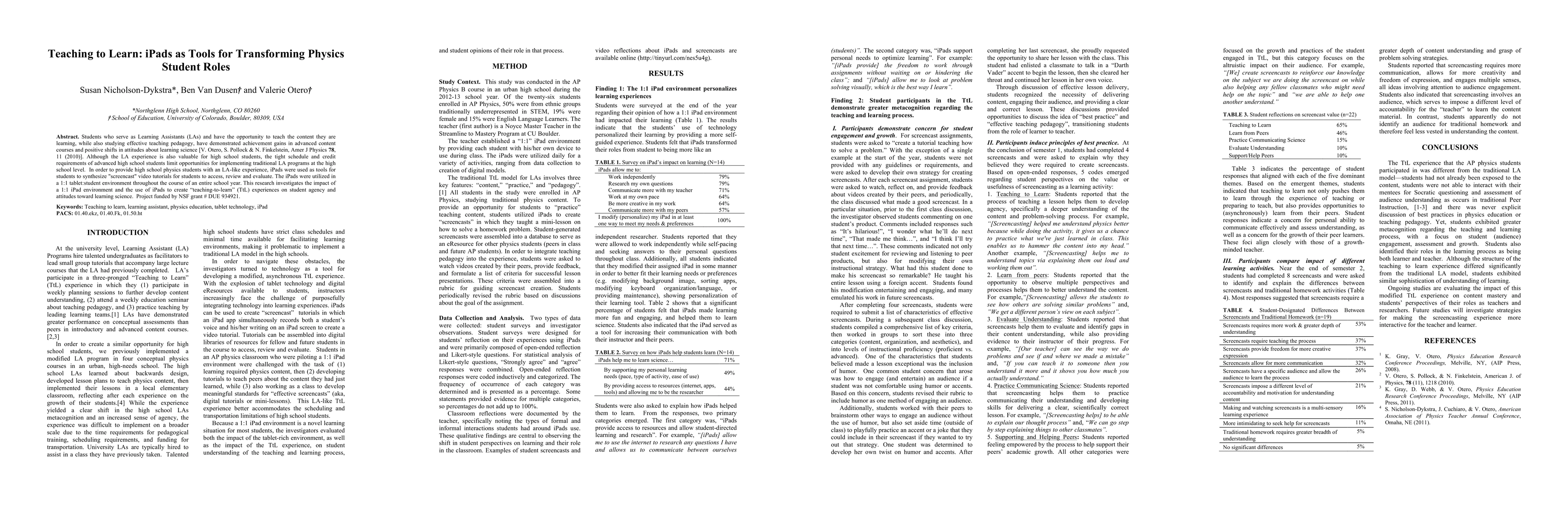 Students who serve as Learning Assistants (LAs) and have the opportunity to teach the content they are learning, while also studying effective teaching pedagogy, have demonstrated achievement gains in advanced content courses and positive shifts in attitudes about learning science [V. Otero, S. Pollock & N. Finkelstein, Amer J Physics 78, 11 (2010)]. Although the LA experience is also valuable for high school students, the tight schedule and credit requirements of advanced high school students limit opportunities for implementing traditional LA programs at the high school level. In order to provide high school physics students with an LA-like experience, iPads were used as tools for students to synthesize screencast video tutorials for students to access, review and evaluate. The iPads were utilized in a one-to-one tablet-to-student environment throughout the course of an entire school year. This research investigates the impact of a one-to-one iPad environment and the use of iPads to create teaching-to-learn (TtL) experiences on student agency and attitudes toward learning science. Project funded by NSF grant # DUE 934921.
