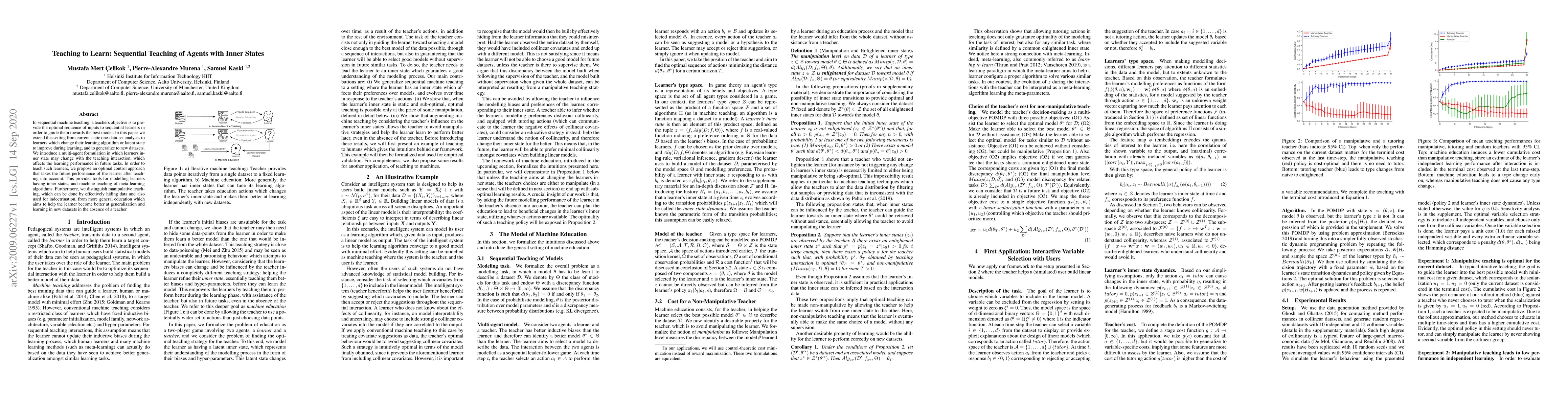 In sequential machine teaching, a teacher's objective is to provide the optimal sequence of inputs to sequential learners in order to guide them towards the best model. In this paper we extend this setting from current static one-data-set analyses to learners which change their learning algorithm or latent state to improve during learning, and to generalize to new datasets. We introduce a multi-agent formulation in which learners' inner state may change with the teaching interaction, which affects the learning performance in future tasks. In order to teach such learners, we propose an optimal control approach that takes the future performance of the learner after teaching into account. This provides tools for modelling learners having inner states, and machine teaching of meta-learning algorithms. Furthermore, we distinguish manipulative teaching, which can be done by effectively hiding data and also used for indoctrination, from more general education which aims to help the learner become better at generalization and learning in new datasets in the absence of a teacher.