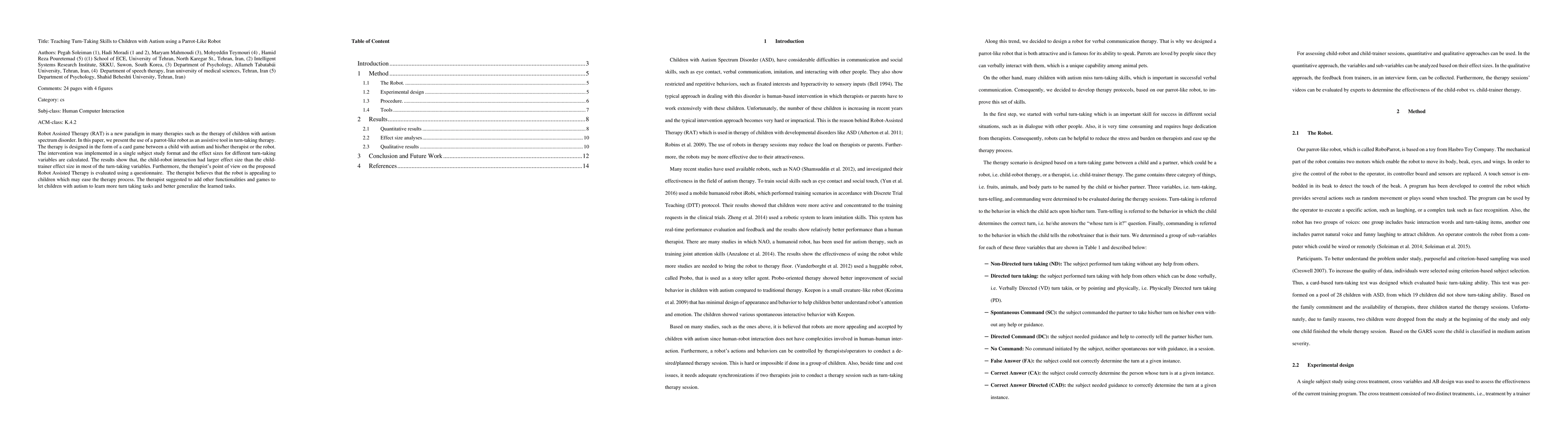 This study explores the use of a parrot-like robot in teaching turn-taking skills to children with autism through a card game. Results indicate that robot interaction had a larger effect size than traditional therapist-child interaction, suggesting the robot's potential to ease therapy and facilitate learning.
