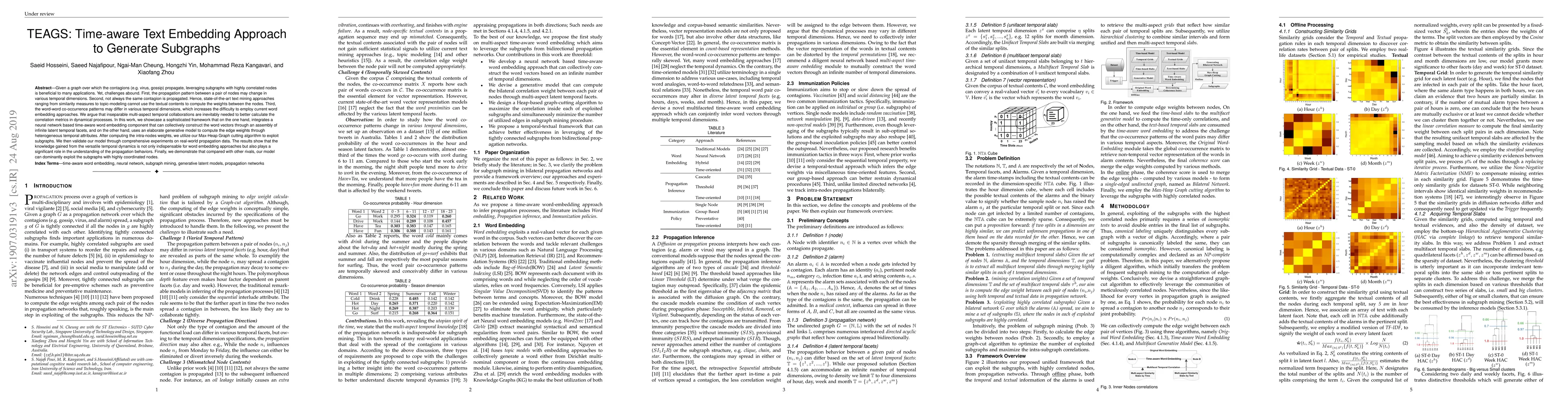 Contagions (e.g. virus, gossip) spread over the nodes in propagation graphs. We can use the temporal and textual data of the nodes to compute the edge weights and then generate subgraphs with highly relevant nodes. This is beneficial to many applications. Yet, challenges abound. First, the propagation pattern between each pair of nodes may change by time. Second, not always the same contagion propagates. Hence, the state-of-the-art text mining approaches including topic-modeling cannot effectively compute the edge weights. Third, since the propagation is affected by time, the word-word co-occurrence patterns may differ in various temporal dimensions, that can decrease the effectiveness of word embedding approaches. We argue that multi-aspect temporal dimensions (hour, day, etc) should be considered to better calculate the correlation weights between the nodes. In this work, we devise a novel framework that on the one hand, integrates a neural network based time-aware word embedding component to construct the word vectors through multiple temporal facets, and on the other hand, uses a temporal generative model to compute the weights. Subsequently, we propose a Max-Heap Graph cutting algorithm to generate subgraphs. We validate our model through comprehensive experiments on real-world datasets. The results show that our model can retrieve the subgraphs more effective than other rivals and the temporal dynamics should be noticed both in word embedding and propagation processes.