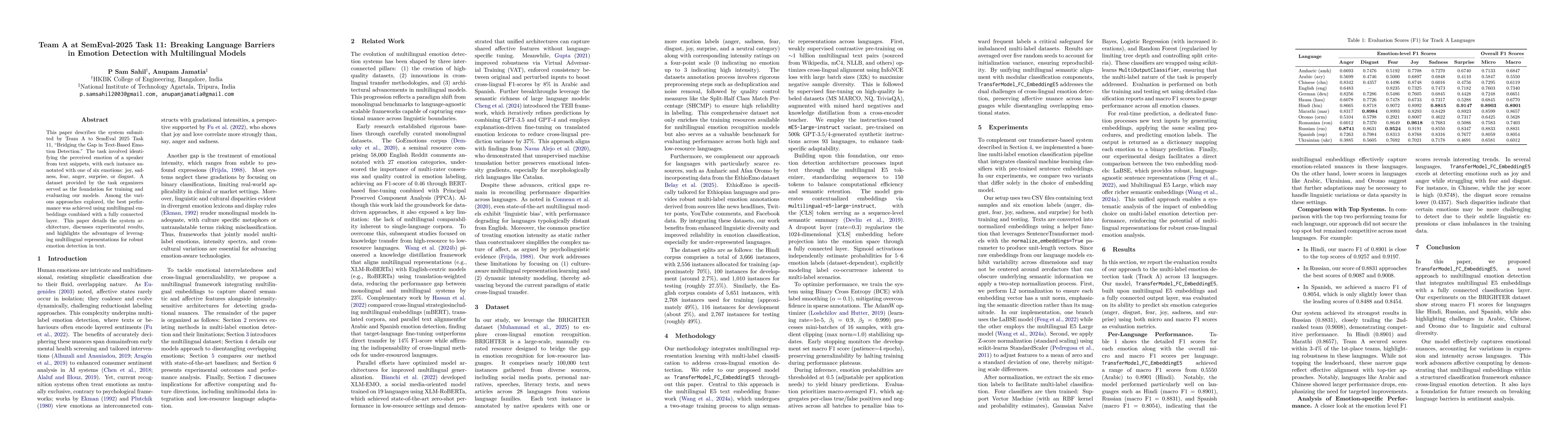 This paper describes the system submitted by Team A to SemEval 2025 Task 11, ``Bridging the Gap in Text-Based Emotion Detection.'' The task involved identifying the perceived emotion of a speaker from text snippets, with each instance annotated with one of six emotions: joy, sadness, fear, anger, surprise, or disgust. A dataset provided by the task organizers served as the foundation for training and evaluating our models. Among the various approaches explored, the best performance was achieved using multilingual embeddings combined with a fully connected layer. This paper details the system architecture, discusses experimental results, and highlights the advantages of leveraging multilingual representations for robust emotion detection in text.