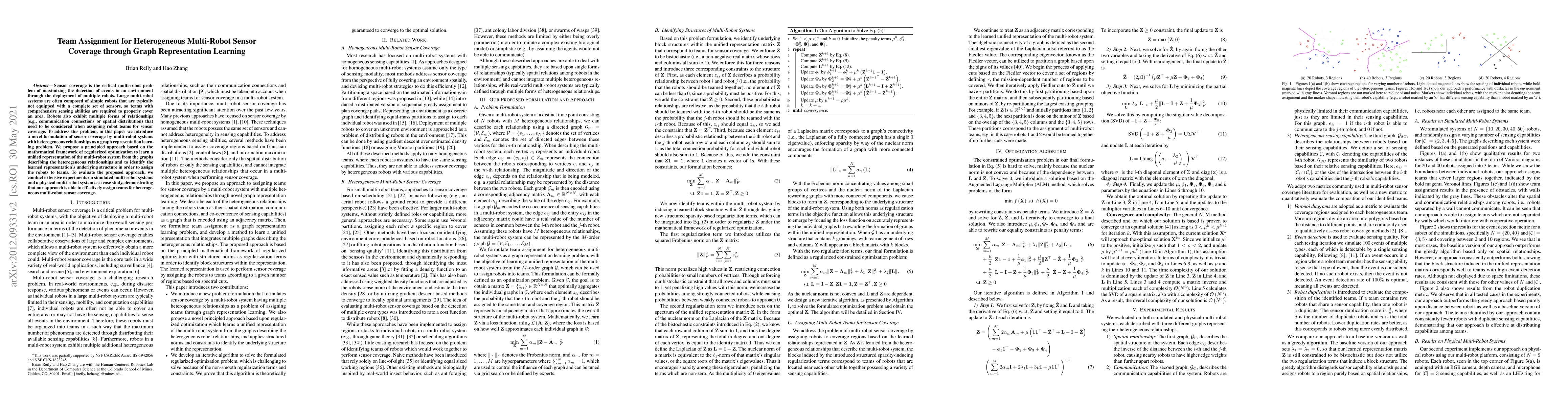 Sensor coverage is the critical multi-robot problem of maximizing the detection of events in an environment through the deployment of multiple robots. Large multi-robot systems are often composed of simple robots that are typically not equipped with a complete set of sensors, so teams with comprehensive sensing abilities are required to properly cover an area. Robots also exhibit multiple forms of relationships (e.g., communication connections or spatial distribution) that need to be considered when assigning robot teams for sensor coverage. To address this problem, in this paper we introduce a novel formulation of sensor coverage by multi-robot systems with heterogeneous relationships as a graph representation learning problem. We propose a principled approach based on the mathematical framework of regularized optimization to learn a unified representation of the multi-robot system from the graphs describing the heterogeneous relationships and to identify the learned representation's underlying structure in order to assign the robots to teams. To evaluate the proposed approach, we conduct extensive experiments on simulated multi-robot systems and a physical multi-robot system as a case study, demonstrating that our approach is able to effectively assign teams for heterogeneous multi-robot sensor coverage.