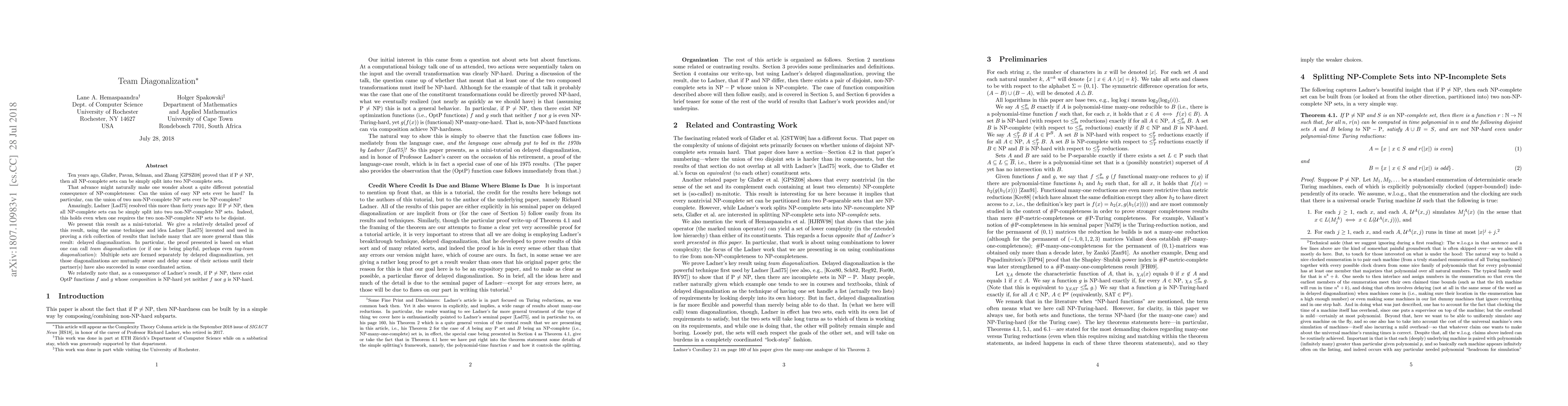 Ten years ago, Gla{\ss}er, Pavan, Selman, and Zhang [GPSZ08] proved that if P $\neq$ NP, then all NP-complete sets can be simply split into two NP-complete sets. That advance might naturally make one wonder about a quite different potential consequence of NP-completeness: Can the union of easy NP sets ever be hard? In particular, can the union of two non-NP-complete NP sets ever be NP-complete? Amazingly, Ladner [Lad75] resolved this more than forty years ago: If P $\neq$ NP, then all NP-complete sets can be simply split into two non-NP-complete NP sets. Indeed, this holds even when one requires the two non-NP-complete NP sets to be disjoint. We present this result as a mini-tutorial. We give a relatively detailed proof of this result, using the same technique and idea Ladner [Lad75] invented and used in proving a rich collection of results that include many that are more general than this result: delayed diagonalization. In particular, the proof presented is based on what one can call team diagonalization (or if one is being playful, perhaps even tag-team diagonalization): Multiple sets are formed separately by delayed diagonalization, yet those diagonalizations are mutually aware and delay some of their actions until their partner(s) have also succeeded in some coordinated action. We relatedly note that, as a consequence of Ladner's result, if P $\neq$ NP, there exist OptP functions f and g whose composition is NP-hard yet neither f nor g is NP-hard.
