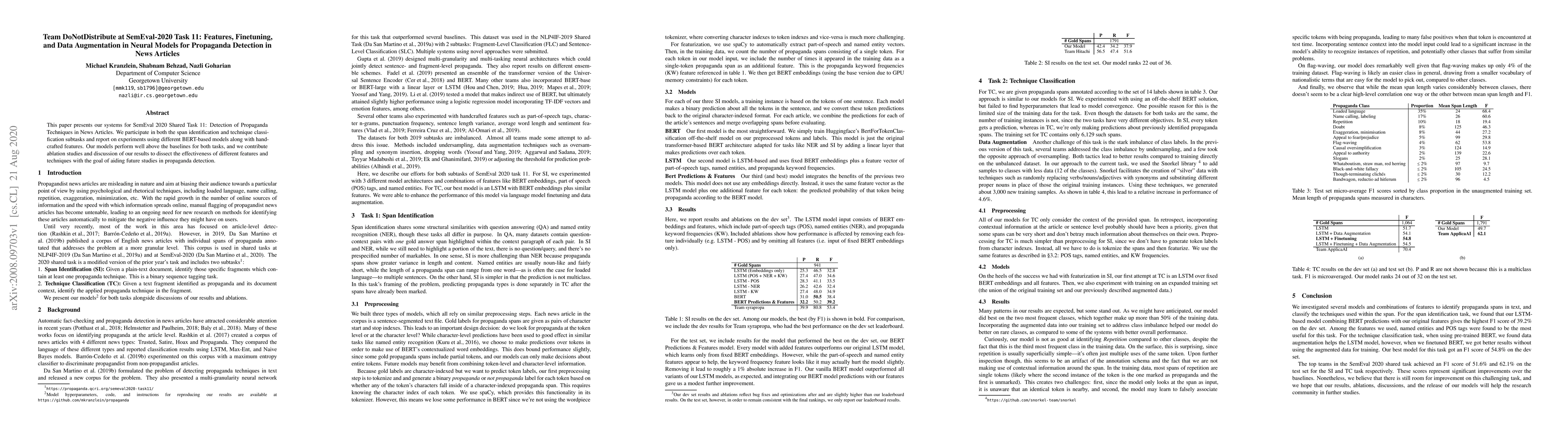 This paper details Team DoNotDistribute's systems for detecting propaganda in news articles using BERT-based models and handcrafted features, achieving superior results in span identification and technique classification. The study includes ablation analyses to evaluate the impact of various features and techniques, aiming to inform future research in this domain.
