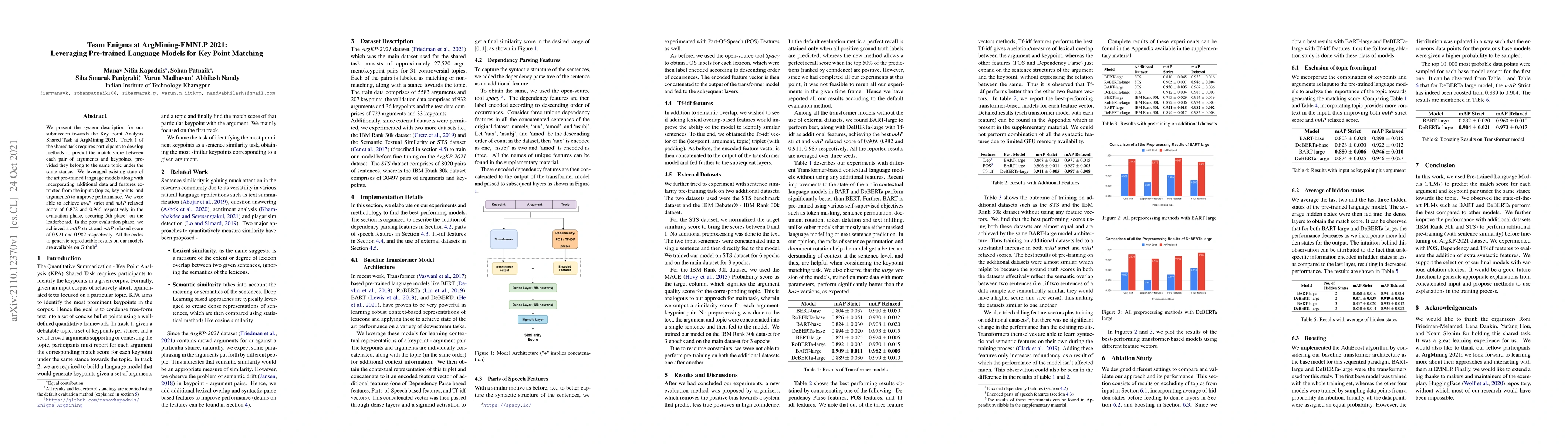We present the system description for our submission towards the Key Point Analysis Shared Task at ArgMining 2021. Track 1 of the shared task requires participants to develop methods to predict the match score between each pair of arguments and keypoints, provided they belong to the same topic under the same stance. We leveraged existing state of the art pre-trained language models along with incorporating additional data and features extracted from the inputs (topics, key points, and arguments) to improve performance. We were able to achieve mAP strict and mAP relaxed score of 0.872 and 0.966 respectively in the evaluation phase, securing 5th place on the leaderboard. In the post evaluation phase, we achieved a mAP strict and mAP relaxed score of 0.921 and 0.982 respectively. All the codes to generate reproducible results on our models are available on Github.