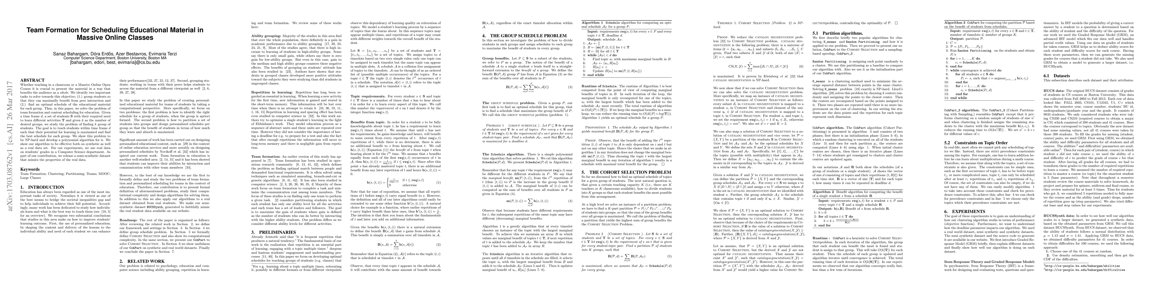 Whether teaching in a classroom or a Massive Online Open Course it is crucial to present the material in a way that benefits the audience as a whole. We identify two important tasks to solve towards this objective, 1 group students so that they can maximally benefit from peer interaction and 2 find an optimal schedule of the educational material for each group. Thus, in this paper, we solve the problem of team formation and content scheduling for education. Given a time frame d, a set of students S with their required need to learn different activities T and given k as the number of desired groups, we study the problem of finding k group of students. The goal is to teach students within time frame d such that their potential for learning is maximized and find the best schedule for each group. We show this problem to be NP-hard and develop a polynomial algorithm for it. We show our algorithm to be effective both on synthetic as well as a real data set. For our experiments, we use real data on students' grades in a Computer Science department. As part of our contribution, we release a semi-synthetic dataset that mimics the properties of the real data.