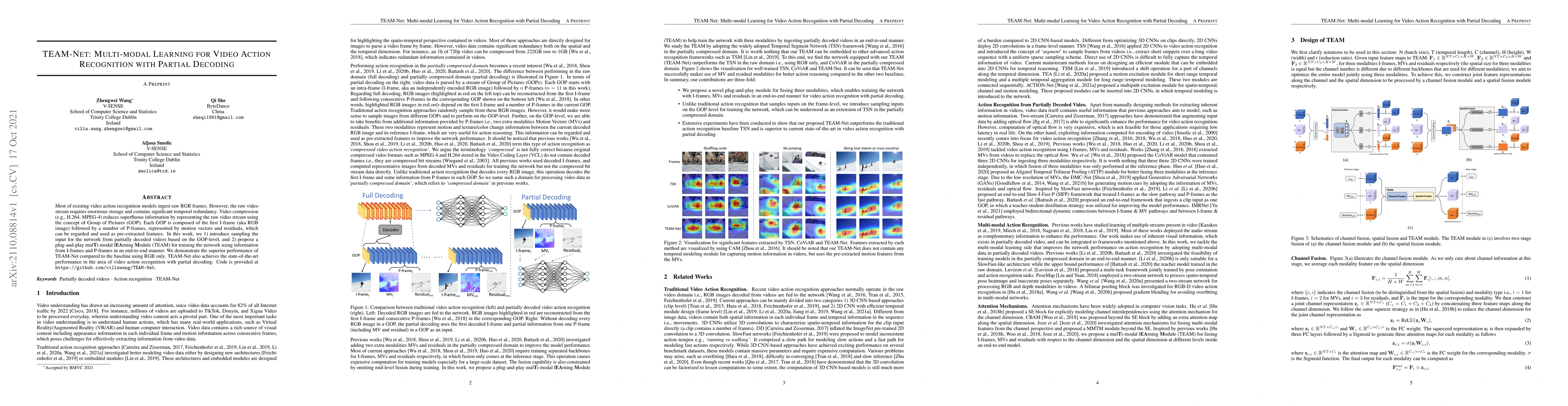 Most of existing video action recognition models ingest raw RGB frames. However, the raw video stream requires enormous storage and contains significant temporal redundancy. Video compression (e.g., H.264, MPEG-4) reduces superfluous information by representing the raw video stream using the concept of Group of Pictures (GOP). Each GOP is composed of the first I-frame (aka RGB image) followed by a number of P-frames, represented by motion vectors and residuals, which can be regarded and used as pre-extracted features. In this work, we 1) introduce sampling the input for the network from partially decoded videos based on the GOP-level, and 2) propose a plug-and-play mulTi-modal lEArning Module (TEAM) for training the network using information from I-frames and P-frames in an end-to-end manner. We demonstrate the superior performance of TEAM-Net compared to the baseline using RGB only. TEAM-Net also achieves the state-of-the-art performance in the area of video action recognition with partial decoding. Code is provided at https://github.com/villawang/TEAM-Net.