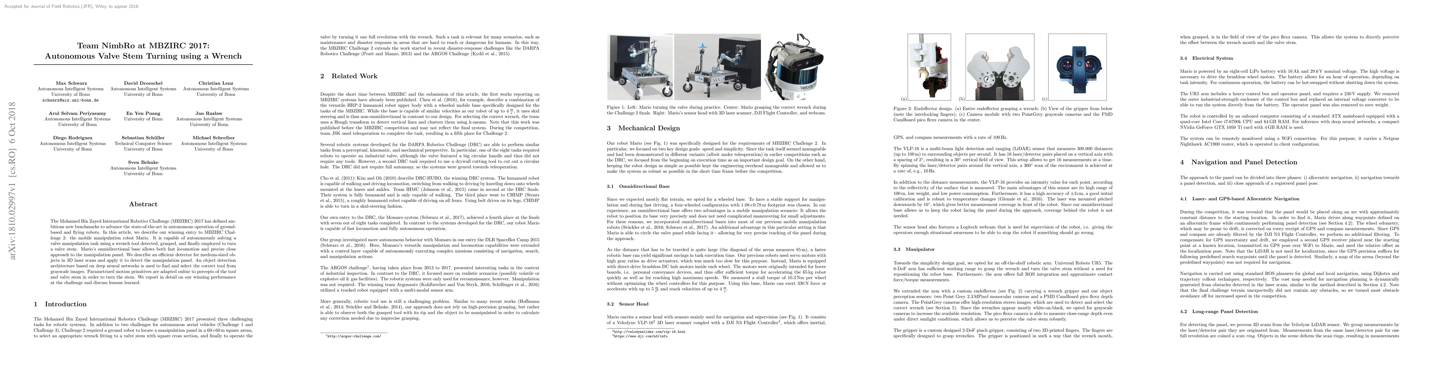 Team NimbRo's winning mobile manipulation robot Mario autonomously solved the valve manipulation task at MBZIRC 2017 using a wrench, employing efficient 3D object detection and deep neural networks for tool selection, and adaptive motion primitives for precise valve stem turning. The team's performance highlights advancements in autonomous robot operation and manipulation.