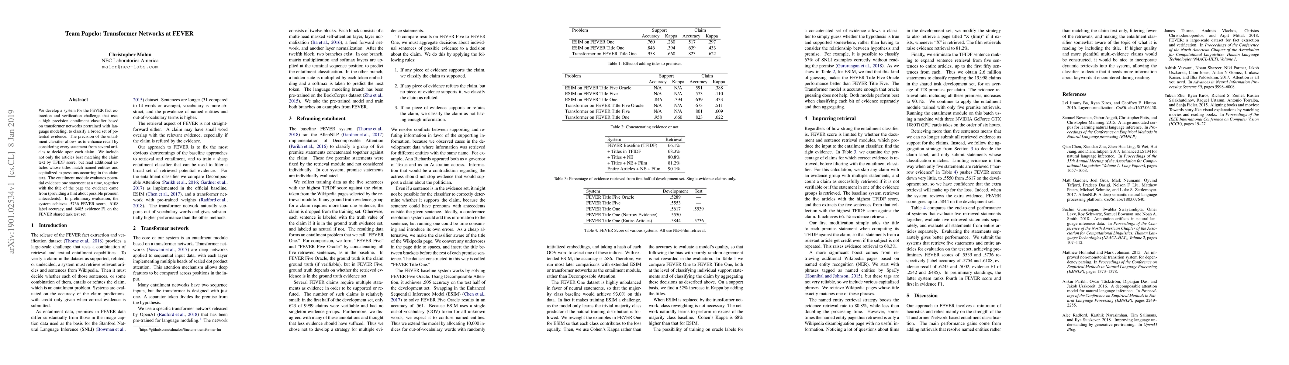 Team Papelo utilizes transformer networks for the FEVER fact extraction and verification challenge, achieving high precision with an entailment classifier. The system enhances recall by evaluating evidence from multiple articles, including those matching named entities in the claim text, and achieves a preliminary FEVER score of .5736.