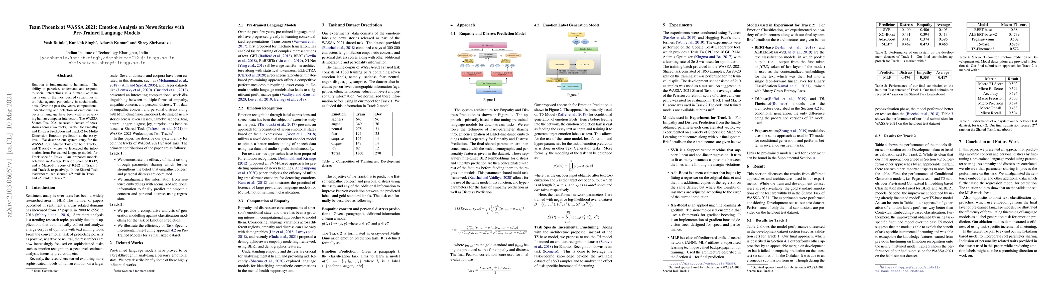Team Phoenix's system for the WASSA 2021 Shared Task utilized pre-trained language models to analyze emotions in news stories, achieving notable rankings and performance metrics. The team secured 4th place in Track 1 and 2nd place in Track 2, demonstrating effective emotion detection across multiple dimensions.