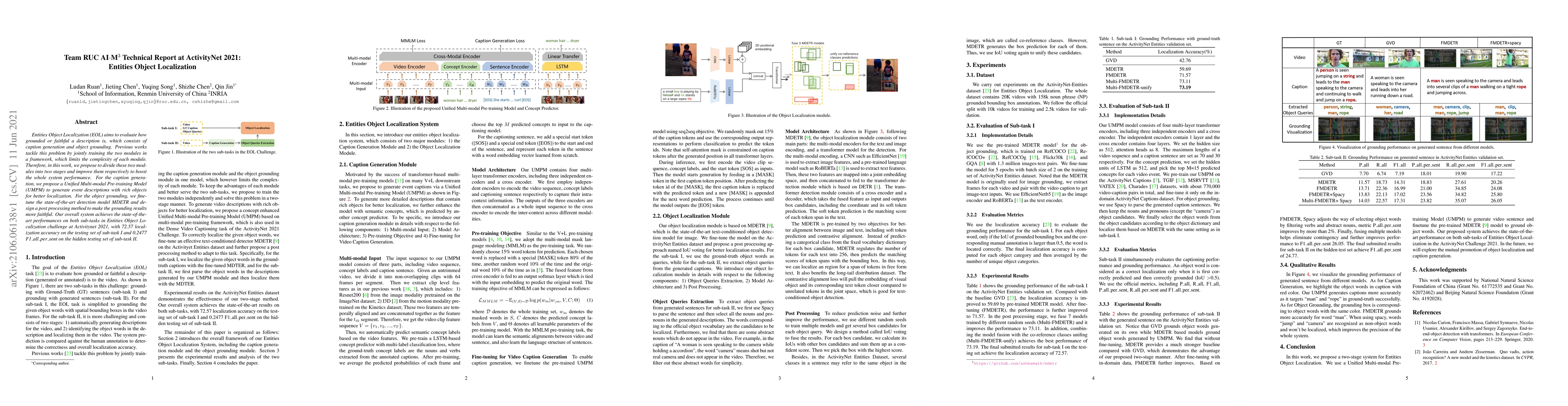 Entities Object Localization (EOL) aims to evaluate how grounded or faithful a description is, which consists of caption generation and object grounding. Previous works tackle this problem by jointly training the two modules in a framework, which limits the complexity of each module. Therefore, in this work, we propose to divide these two modules into two stages and improve them respectively to boost the whole system performance. For the caption generation, we propose a Unified Multi-modal Pre-training Model (UMPM) to generate event descriptions with rich objects for better localization. For the object grounding, we fine-tune the state-of-the-art detection model MDETR and design a post processing method to make the grounding results more faithful. Our overall system achieves the state-of-the-art performances on both sub-tasks in Entities Object Localization challenge at Activitynet 2021, with 72.57 localization accuracy on the testing set of sub-task I and 0.2477 F1_all_per_sent on the hidden testing set of sub-task II.