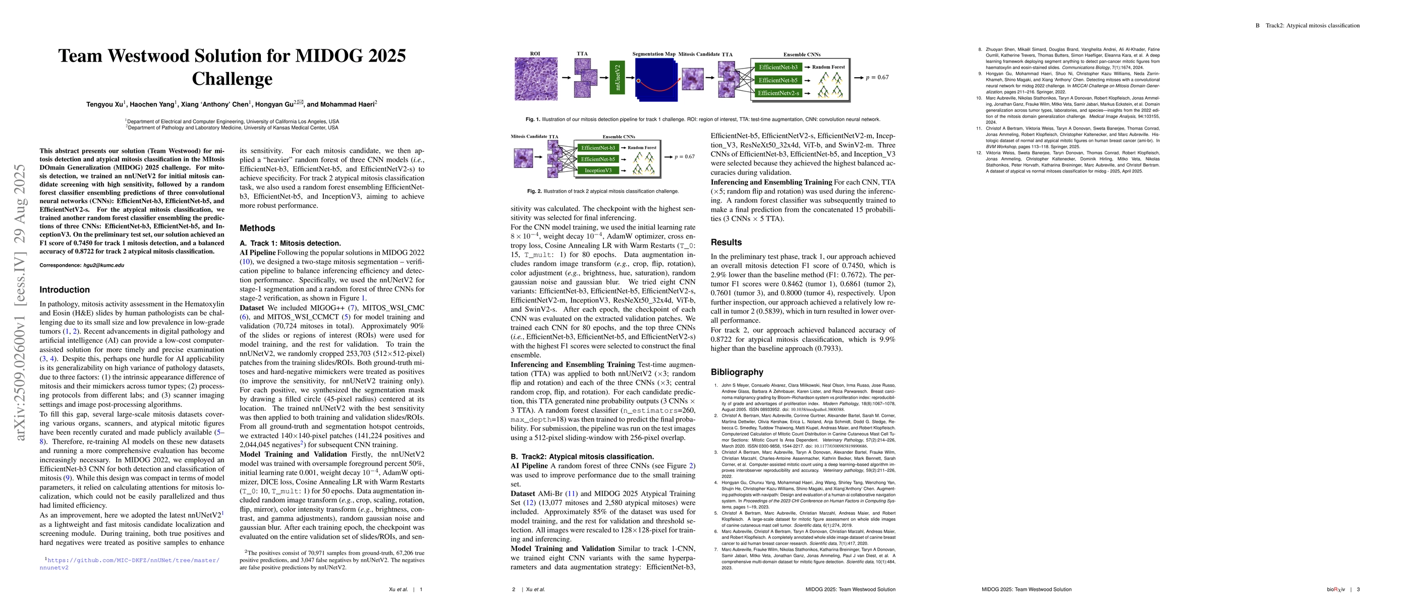 This abstract presents our solution (Team Westwood) for mitosis detection and atypical mitosis classification in the MItosis DOmain Generalization (MIDOG) 2025 challenge. For mitosis detection, we trained an nnUNetV2 for initial mitosis candidate screening with high sensitivity, followed by a random forest classifier ensembling predictions of three convolutional neural networks (CNNs): EfficientNet-b3, EfficientNet-b5, and EfficientNetV2-s. For the atypical mitosis classification, we trained another random forest classifier ensembling the predictions of three CNNs: EfficientNet-b3, EfficientNet-b5, and InceptionV3. On the preliminary test set, our solution achieved an F1 score of 0.7450 for track 1 mitosis detection, and a balanced accuracy of 0.8722 for track 2 atypical mitosis classification.