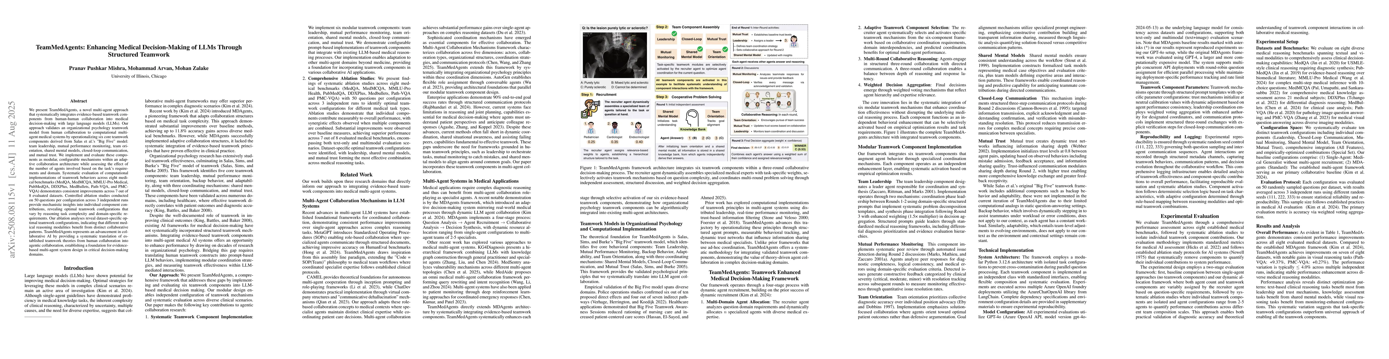 The research presents TeamMedAgents, a multi-agent approach that integrates evidence-based teamwork components from human collaboration into medical decision-making with large language models (LLMs). It validates an organizational psychology teamwork model, operationalizing six core teamwork components: team leadership, mutual performance monitoring, team orientation, shared mental models, closed-loop communication, and mutual trust.