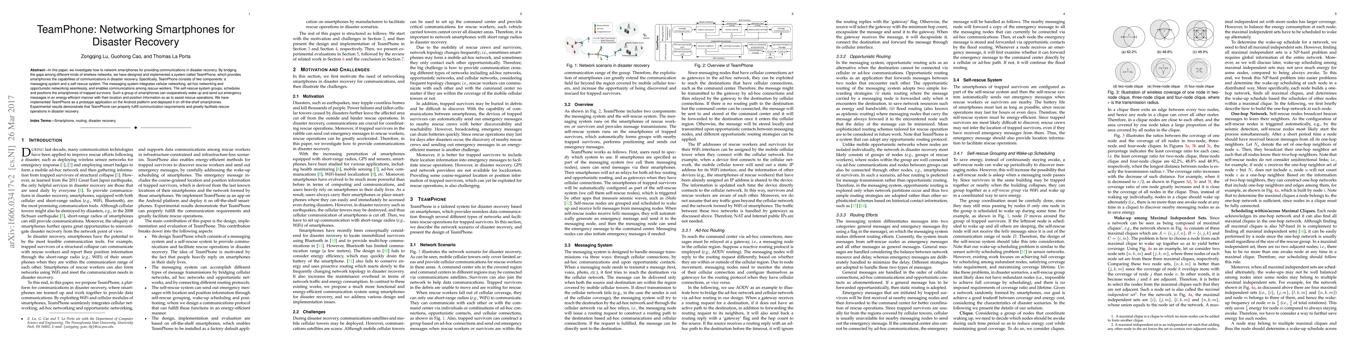 TeamPhone is a system designed to network smartphones for disaster recovery communications, integrating cellular, ad-hoc, and opportunistic networks. It includes a messaging system for rescue worker communication and a self-rescue system for trapped survivors, facilitating efficient emergency messaging.