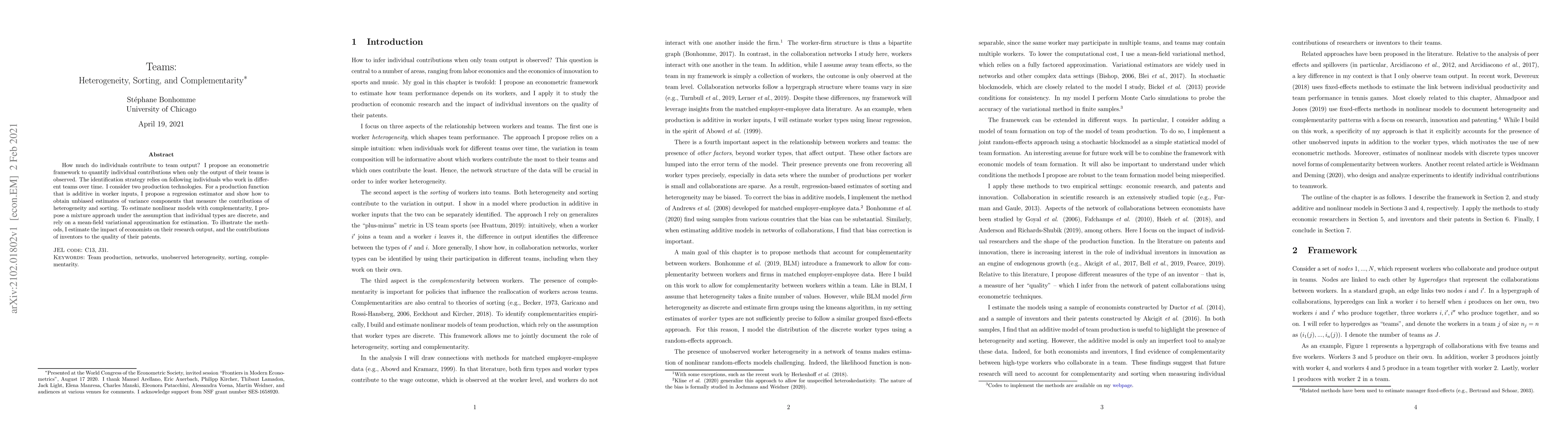 How much do individuals contribute to team output? I propose an econometric framework to quantify individual contributions when only the output of their teams is observed. The identification strategy relies on following individuals who work in different teams over time. I consider two production technologies. For a production function that is additive in worker inputs, I propose a regression estimator and show how to obtain unbiased estimates of variance components that measure the contributions of heterogeneity and sorting. To estimate nonlinear models with complementarity, I propose a mixture approach under the assumption that individual types are discrete, and rely on a mean-field variational approximation for estimation. To illustrate the methods, I estimate the impact of economists on their research output, and the contributions of inventors to the quality of their patents.