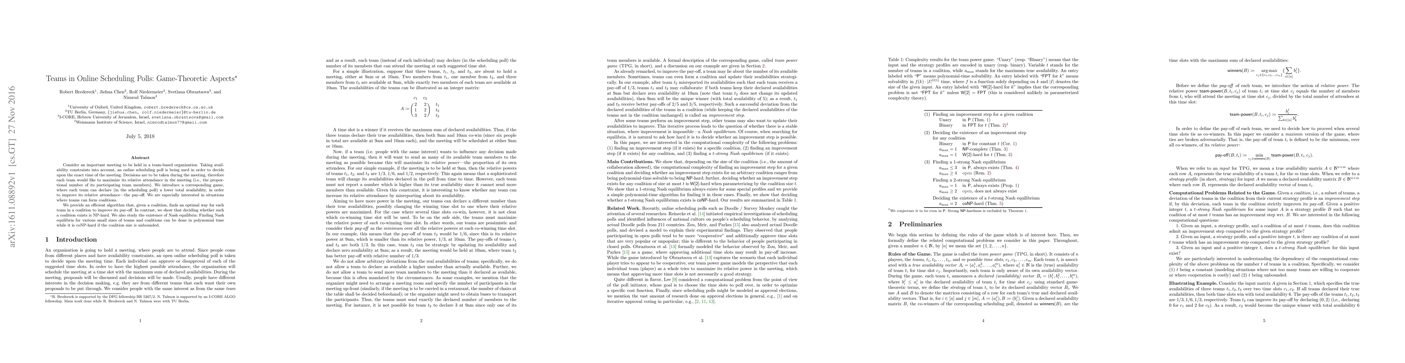 This paper explores a game-theoretic model for online scheduling polls in team-based organizations, focusing on maximizing relative attendance. It introduces an efficient algorithm for optimizing attendance within coalitions but proves the problem of coalition existence to be NP-hard. Additionally, it examines the complexity of finding Nash equilibria, showing polynomial-time solvability for small coalitions and coNP-hardness for large, unbounded coalitions.