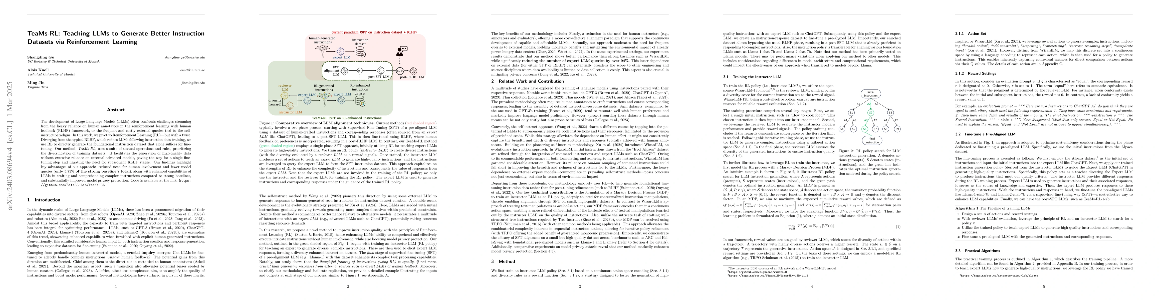 TeaMs-RL leverages Reinforcement Learning to autonomously generate foundational instruction datasets for fine-tuning Large Language Models, reducing reliance on human annotators and external queries while enhancing model capabilities and privacy.