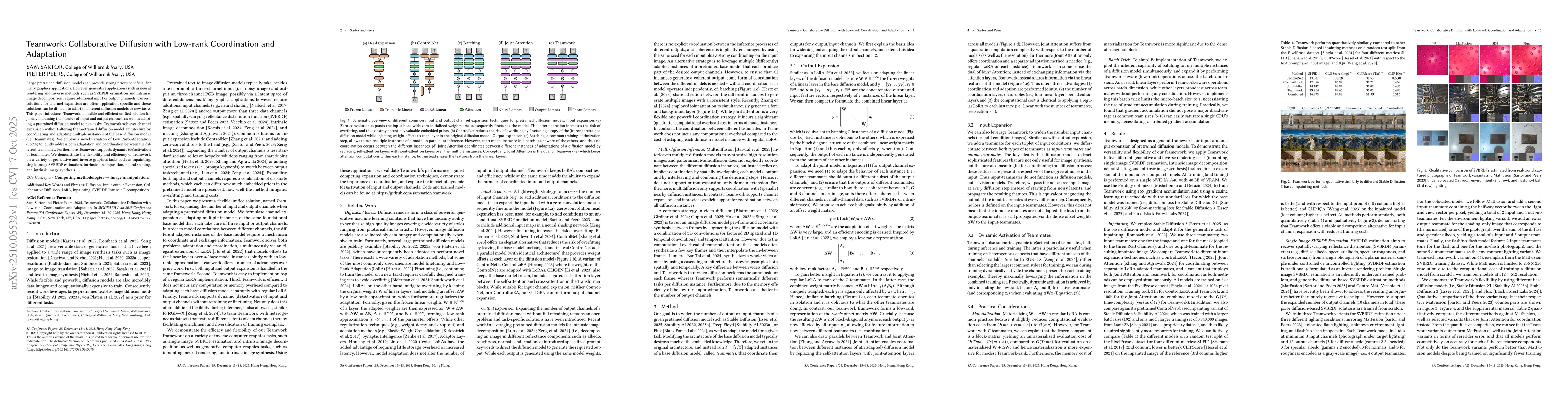 Large pretrained diffusion models can provide strong priors beneficial for many graphics applications. However, generative applications such as neural rendering and inverse methods such as SVBRDF estimation and intrinsic image decomposition require additional input or output channels. Current solutions for channel expansion are often application specific and these solutions can be difficult to adapt to different diffusion models or new tasks. This paper introduces Teamwork: a flexible and efficient unified solution for jointly increasing the number of input and output channels as well as adapting a pretrained diffusion model to new tasks. Teamwork achieves channel expansion without altering the pretrained diffusion model architecture by coordinating and adapting multiple instances of the base diffusion model (\ie, teammates). We employ a novel variation of Low Rank-Adaptation (LoRA) to jointly address both adaptation and coordination between the different teammates. Furthermore Teamwork supports dynamic (de)activation of teammates. We demonstrate the flexibility and efficiency of Teamwork on a variety of generative and inverse graphics tasks such as inpainting, single image SVBRDF estimation, intrinsic decomposition, neural shading, and intrinsic image synthesis.