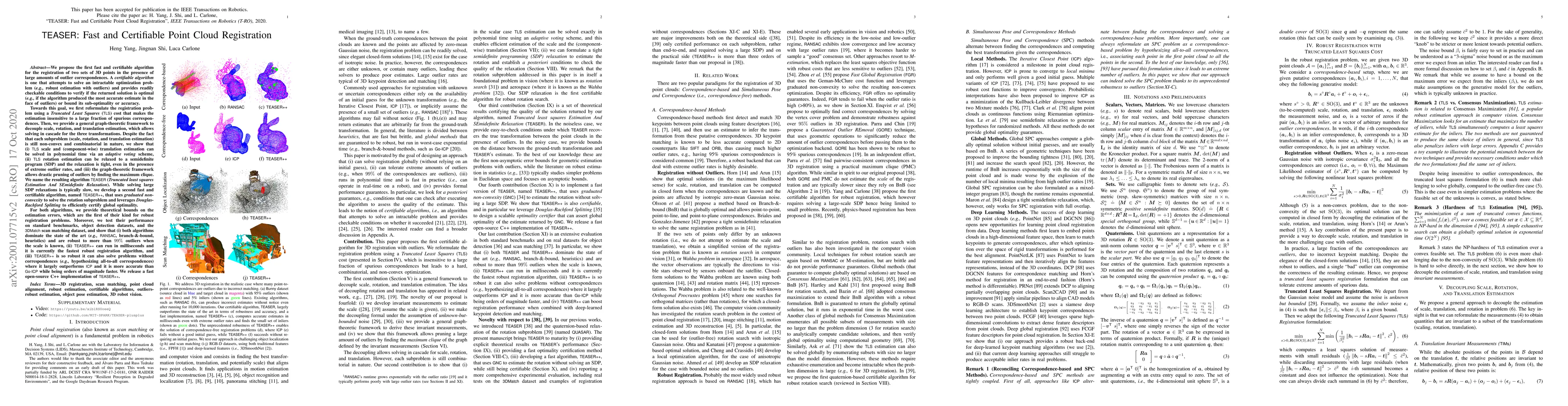 We propose the first fast and certifiable algorithm for the registration of two sets of 3D points in the presence of large amounts of outlier correspondences. We first reformulate the registration problem using a Truncated Least Squares (TLS) cost that is insensitive to a large fraction of spurious correspondences. Then, we provide a general graph-theoretic framework to decouple scale, rotation, and translation estimation, which allows solving in cascade for the three transformations. Despite the fact that each subproblem is still non-convex and combinatorial in nature, we show that (i) TLS scale and (component-wise) translation estimation can be solved in polynomial time via adaptive voting, (ii) TLS rotation estimation can be relaxed to a semidefinite program (SDP) and the relaxation is tight, even in the presence of extreme outlier rates, and (iii) the graph-theoretic framework allows drastic pruning of outliers by finding the maximum clique. We name the resulting algorithm TEASER (Truncated least squares Estimation And SEmidefinite Relaxation). While solving large SDP relaxations is typically slow, we develop a second fast and certifiable algorithm, named TEASER++, that uses graduated non-convexity to solve the rotation subproblem and leverages Douglas-Rachford Splitting to efficiently certify global optimality. For both algorithms, we provide theoretical bounds on the estimation errors, which are the first of their kind for robust registration problems. Moreover, we test their performance on standard, object detection, and the 3DMatch benchmarks, and show that (i) both algorithms dominate the state of the art and are robust to more than 99% outliers, (ii) TEASER++ can run in milliseconds, and (iii) TEASER++ is so robust it can also solve problems without correspondences, where it largely outperforms ICP and it is more accurate than Go-ICP while being orders of magnitude faster.