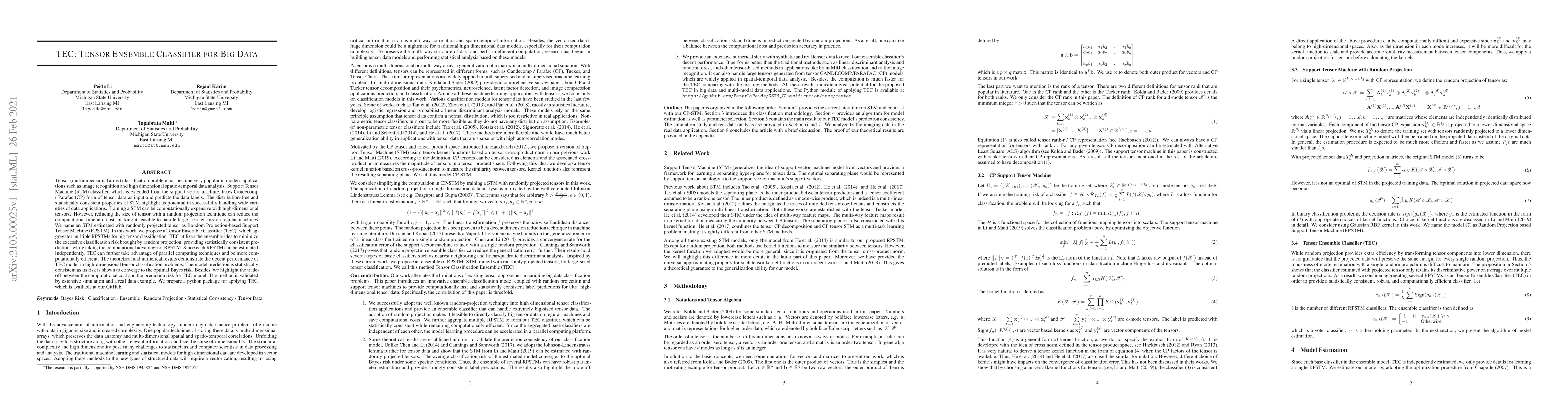 The research introduces Tensor Ensemble Classifier (TEC), a method that combines multiple Random Projection-based Support Tensor Machines (RPSTMs) to efficiently classify large-scale tensor data. TEC minimizes classification risk and maintains statistical consistency, offering a computationally efficient solution for high-dimensional tensor classification problems, supported by theoretical and numerical results, simulations, and a real data example. A Python package for TEC application is provided on GitHub.