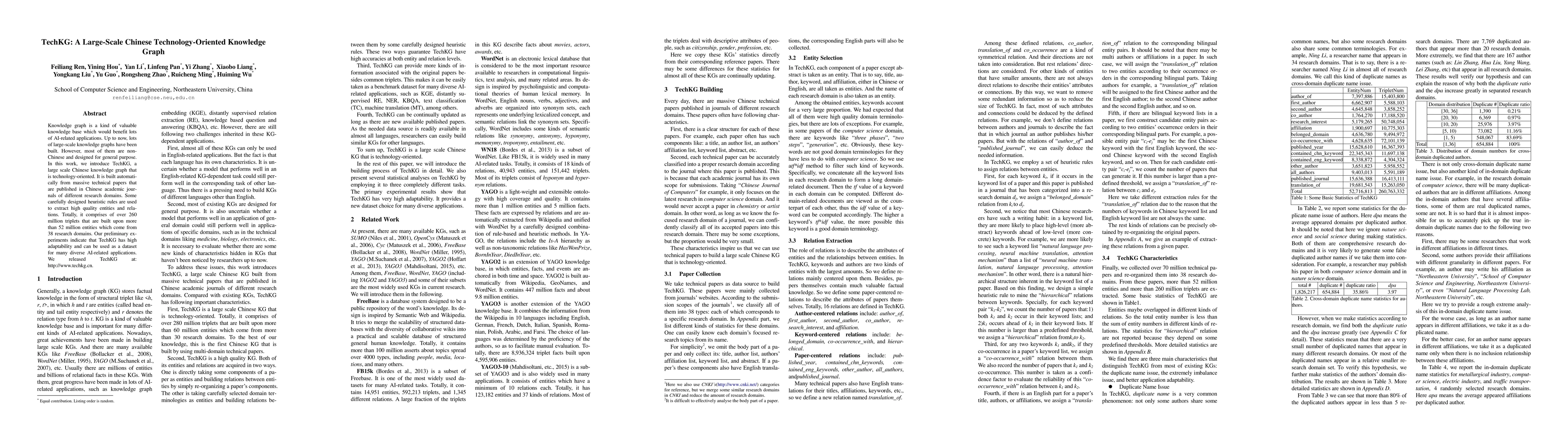 TechKG is a large-scale, technology-oriented Chinese knowledge graph constructed from numerous Chinese academic journals, featuring over 260 million triplets and 52 million entities across 38 research domains. It demonstrates high adaptability and potential for diverse AI applications.