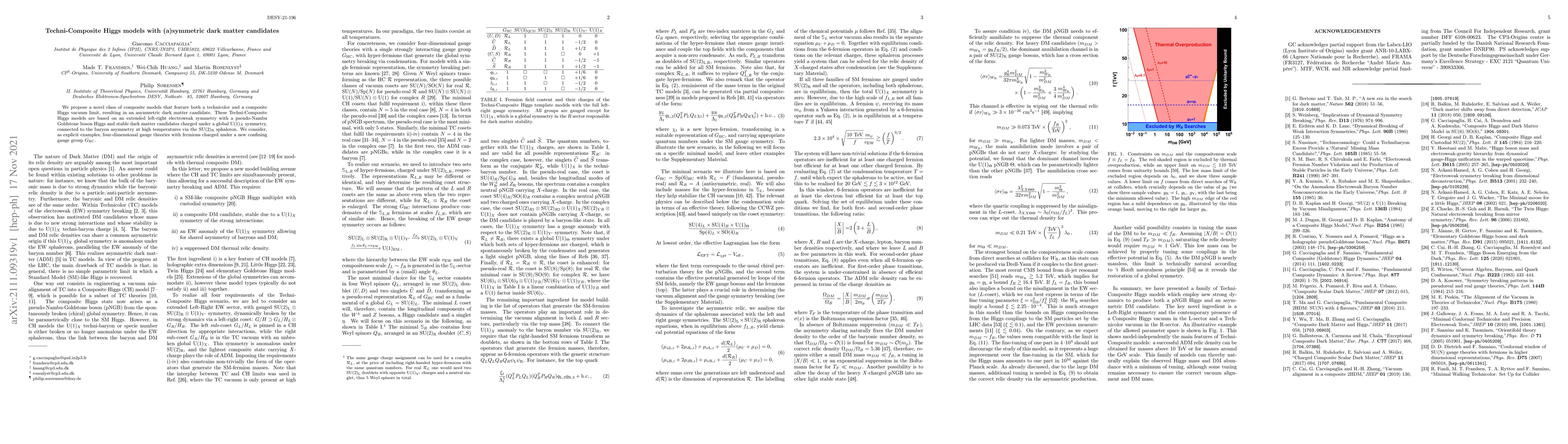 The paper introduces Techni-Composite Higgs models, combining technicolor and composite Higgs, resulting in asymmetric dark matter. These models, based on extended left-right electroweak symmetry, use a pseudo-Nambu Goldstone boson Higgs and stable dark matter candidates. Examples include four-dimensional gauge theories with fermions under a new confining gauge group, connected to baryon asymmetry via SU(2)_R sphaleron.