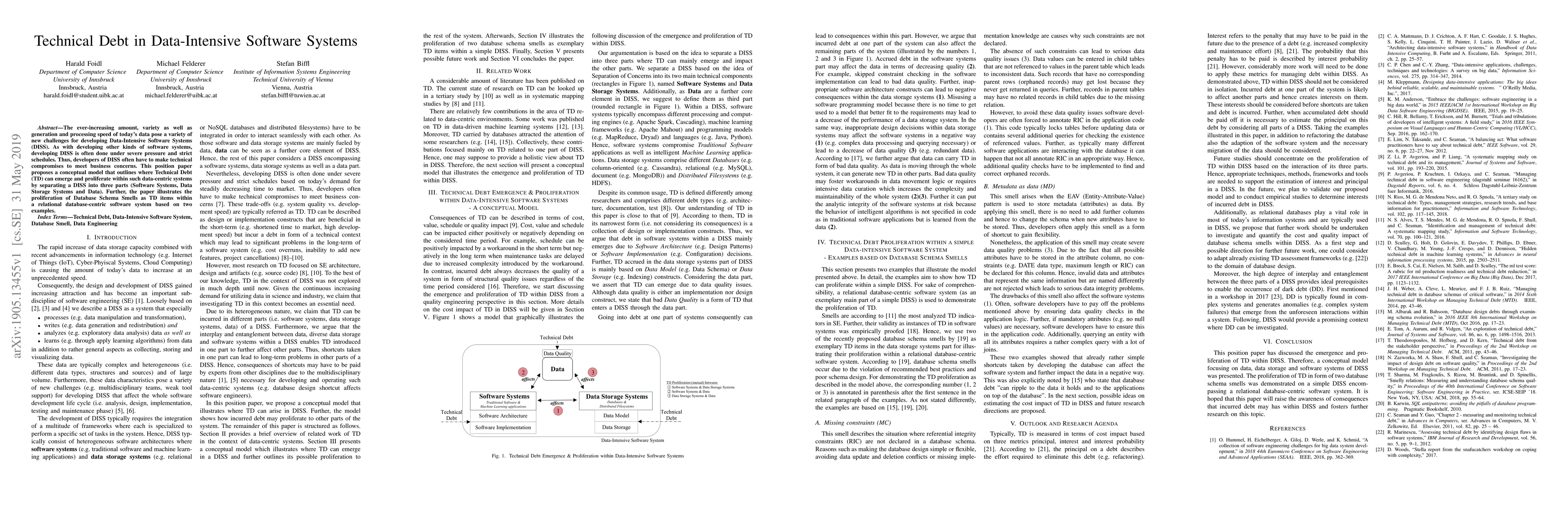 This paper explores how technical debt (TD) arises in Data-Intensive Software Systems (DISS) due to the pressure of tight schedules and business demands. It proposes a conceptual model dividing DISS into three parts and illustrates TD proliferation through Database Schema Smells in relational databases.