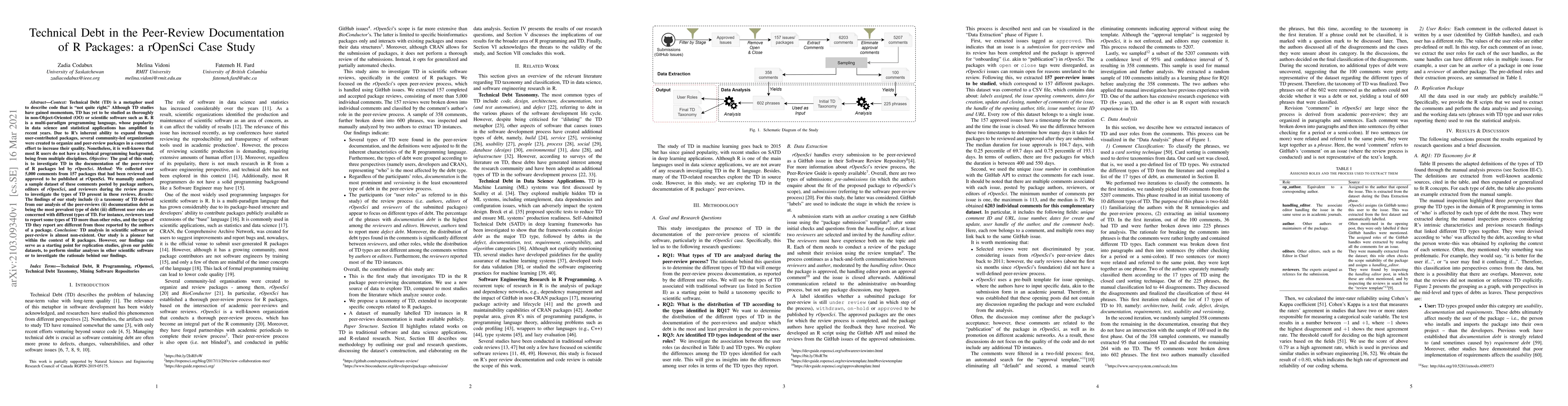 Context: Technical Debt is a metaphor used to describe code that is "not quite right." Although TD studies have gained momentum, TD has yet to be studied as thoroughly in non-Object-Oriented (OO) or scientific software such as R. R is a multi-paradigm programming language, whose popularity in data science and statistical applications has amplified in recent years. Due to R's inherent ability to expand through user-contributed packages, several community-led organizations were created to organize and peer-review packages in a concerted effort to increase their quality. Nonetheless, it is well-known that most R users do not have a technical programming background, being from multiple disciplines. Objective: The goal of this study is to investigate TD in the peer-review documentation of R packages led by rOpenSci. Method: We collected over 5000 comments from 157 packages that had been reviewed and approved to be published at rOpenSci. We manually analyzed a sample dataset of these comments posted by package authors, editors of rOpenSci, and reviewers during the review process to investigate the TD types present in these reviews. Results: The findings of our study include (i) a taxonomy of TD derived from our analysis of the peer-reviews (ii) documentation debt as being the most prevalent type of debt (iii) different user roles are concerned with different types of TD. For instance, reviewers tend to report some TD types more than other roles, and the TD types they report are different from those reported by the authors of a package. Conclusion: TD analysis in scientific software or peer-review is almost non-existent. Our study is a pioneer but within the context of R packages. However, our findings can serve as a starting point for replication studies, given our public datasets, to perform similar analyses in other scientific software or to investigate the rationale behind our findings.