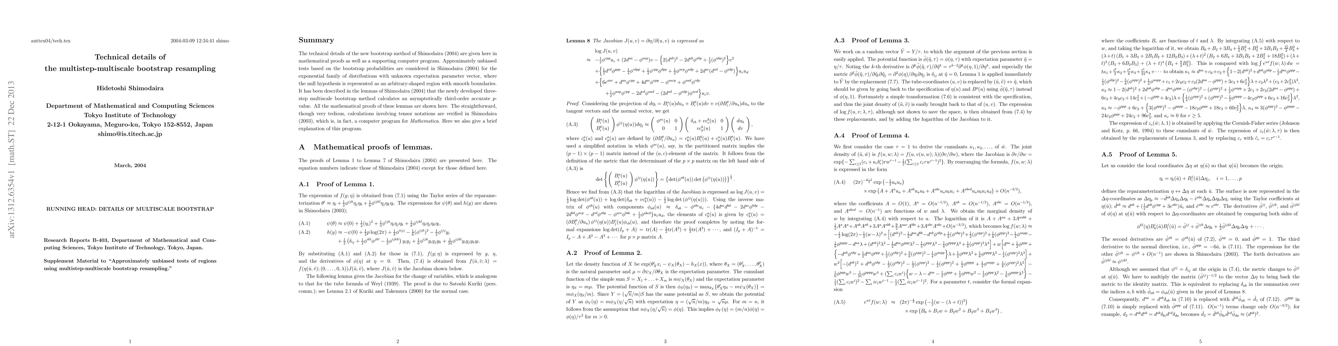 The technical details of the new bootstrap method of Shimodaira (2004) are given here in mathematical proofs as well as a supporting computer program. Approximately unbiased tests based on the bootstrap probabilities are considered in Shimodaira (2004) for the exponential family of distributions with unknown expectation parameter vector, where the null hypothesis is represented as an arbitrary-shaped region with smooth boundaries. It has been described in the lemmas of Shimodaira (2004) that the newly developed three-step multiscale bootstrap method calculates an asymptotically third-order accurate $p$-value. All the mathematical proofs of these lemmas are shown here. The straightforward, though very tedious, calculations involving tensor notations are verified in Shimodaira (2003), which is, in fact, a computer program for Mathematica. Here we also give a brief explanation of this program.