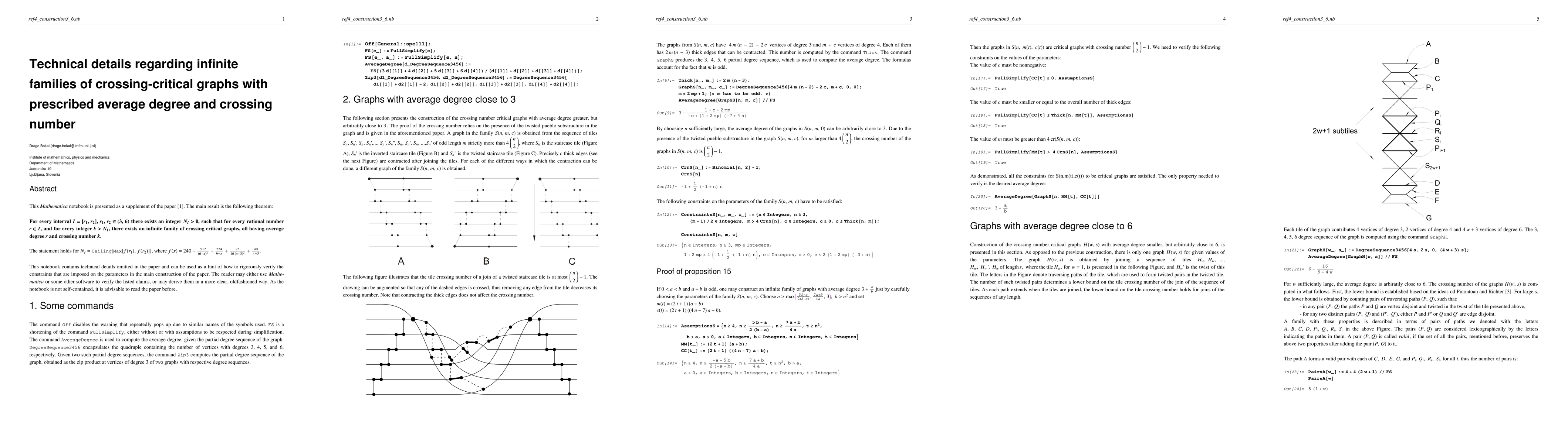 Siran constructed infinite families of k-crossing-critical graphs for every k > 2 and Kochol constructed such families of simple graphs for every k > 1. Richter and Thomassen argued that, for any given k > 0 and r > 5, there are only finitely many simple k-crossing-critical graphs with minimum degree r. Salazar observed that the same argument implies such a conclusion for simple k-crossing-critical graphs of prescribed average degree r > 6. He established the existence of infinite families of simple k-crossing-critical graphs with any prescribed rational average degree r in [4, 6) for infinitely many k and asked about their existence for r in (3, 4). The question was partially settled by Pinontoan and Richter, who answered it positively for r in (3.5, 4). The present contribution uses two new constructions of crossing critical simple graphs along with the one developed by Pinontoan and Richter to unify these results and to answer Salazar's question by the following statement: there exist infinite families of simple k-crossing-critical graphs with any prescribed average degree r in (3, 6), for any k greater than some lower bound N(r). Moreover, a universal lower bound N(I) on k applies for rational numbers in any closed interval I contained in (3, 6). This Mathematica notebook is presented as a supplement of the paper with the aforementioned results. It contains technical details omitted in the paper and can be used as a hint of how to rigorously verify the constraints that are imposed on the parameters in the main construction of the paper. The reader may either use Mathematica or some other software to verify the listed claims, or may derive them in a more clear, oldfashioned way. As the notebook is not self-contained, it is advisable to read the paper before.